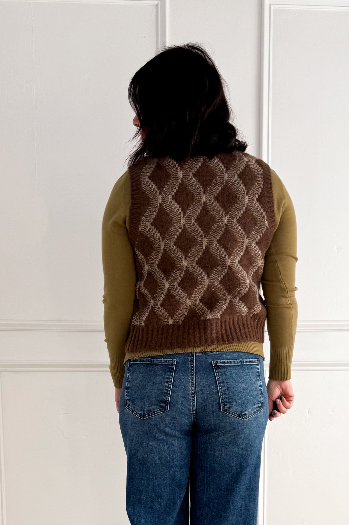 A soft, textured sweater vest with a classic argyle pattern and vintage varsity feel. The button-front design and warm tones make it a standout piece on its own.