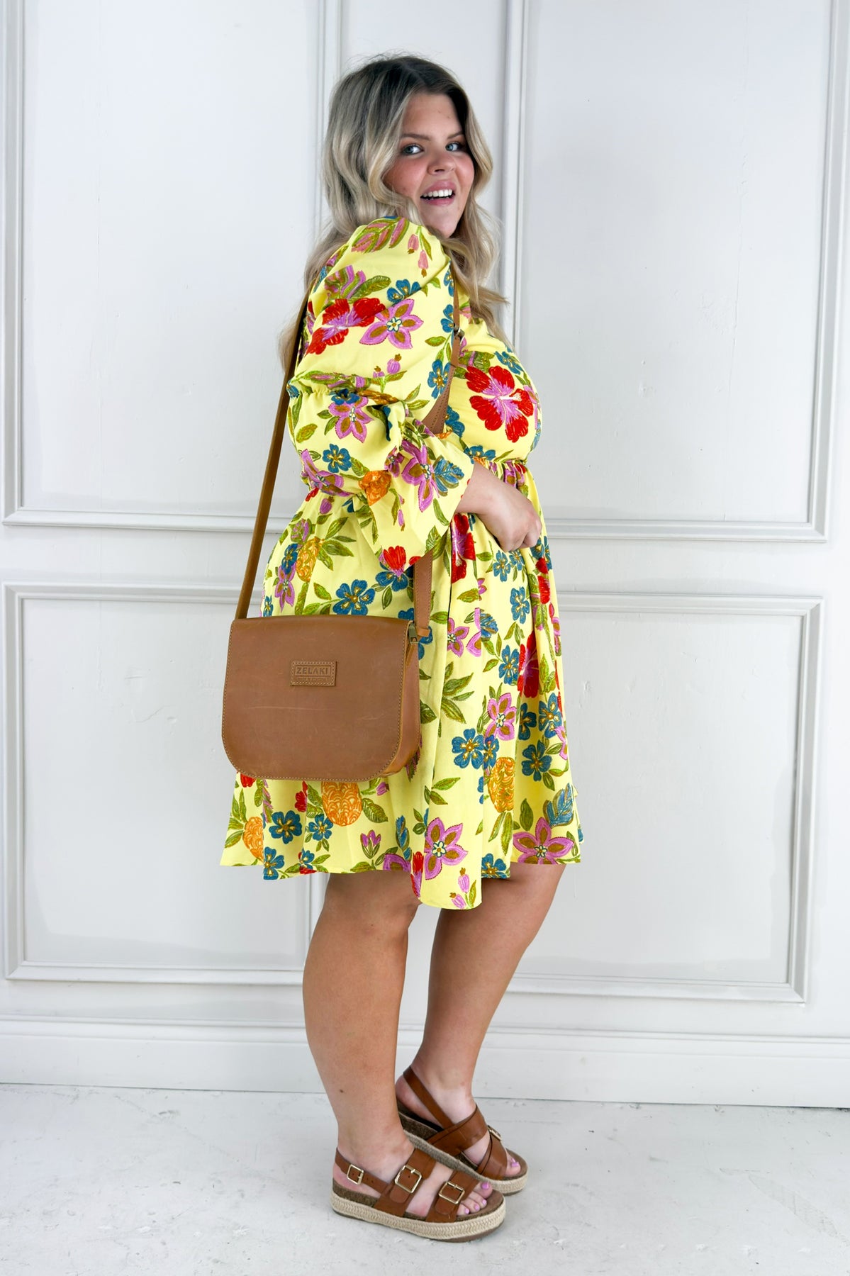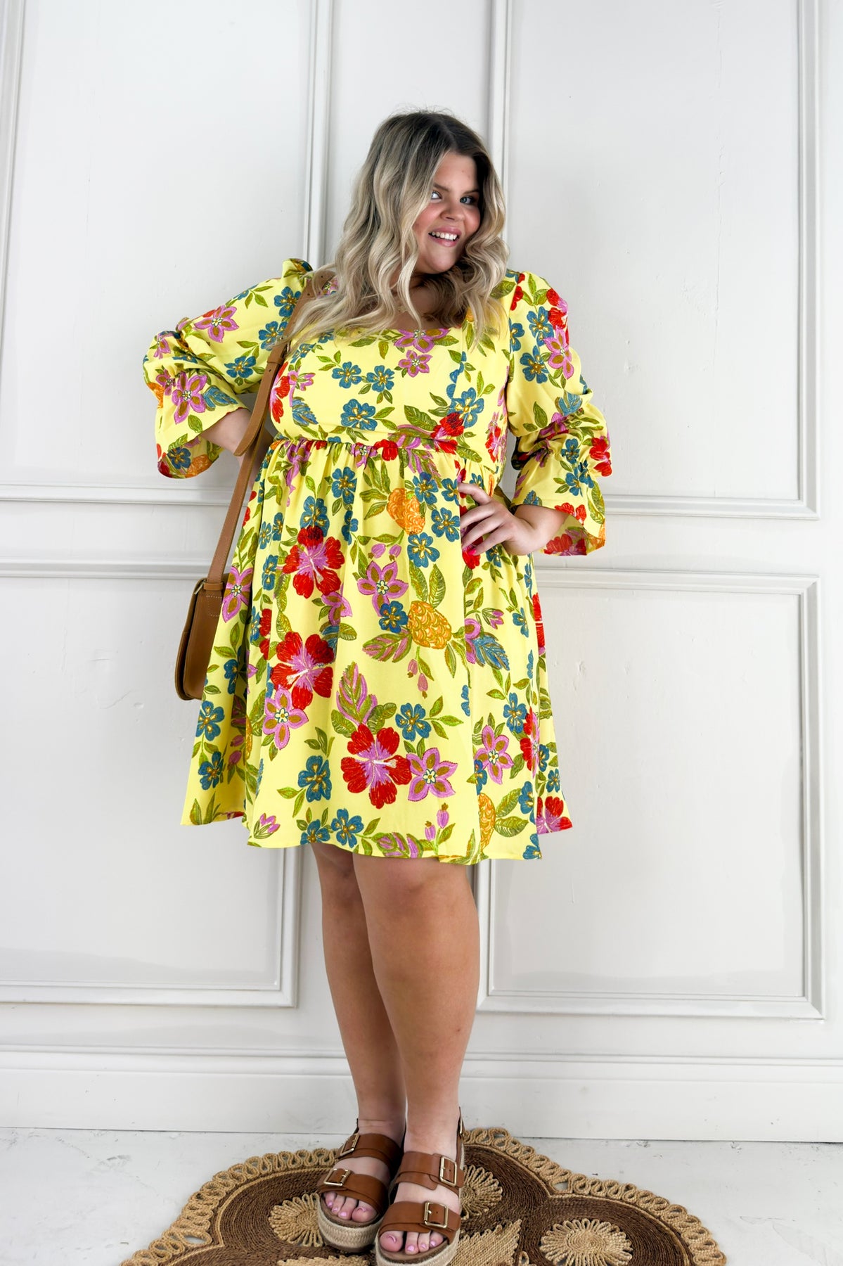 Statement-making and full of charm, this mini dress features vibrant floral embroidery and puffed tiered sleeves that add playful volume and personality.