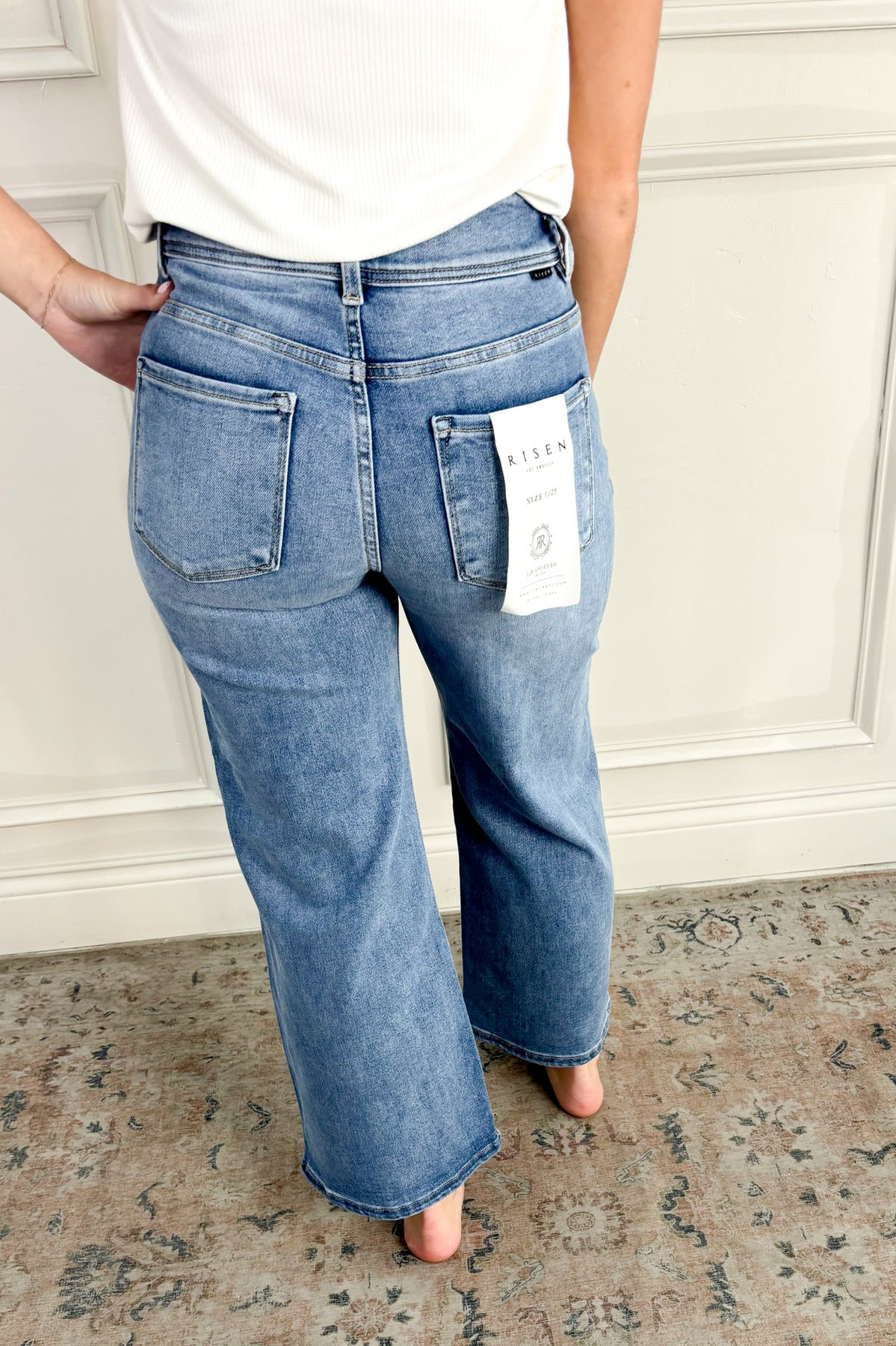 A playful twist on a classic, these Risen high rise jeans feature a wide leg cropped silhouette and an adjustable waist tie with a bow detail—equal parts flattering and fun.