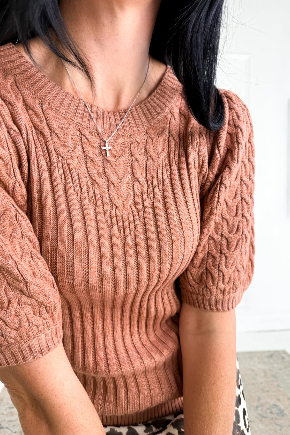 A fitted short-sleeve sweater with classic cable knit texture that feels timeless and a little preppy. Great for pairing with trousers, skirts, or layering under a blazer.