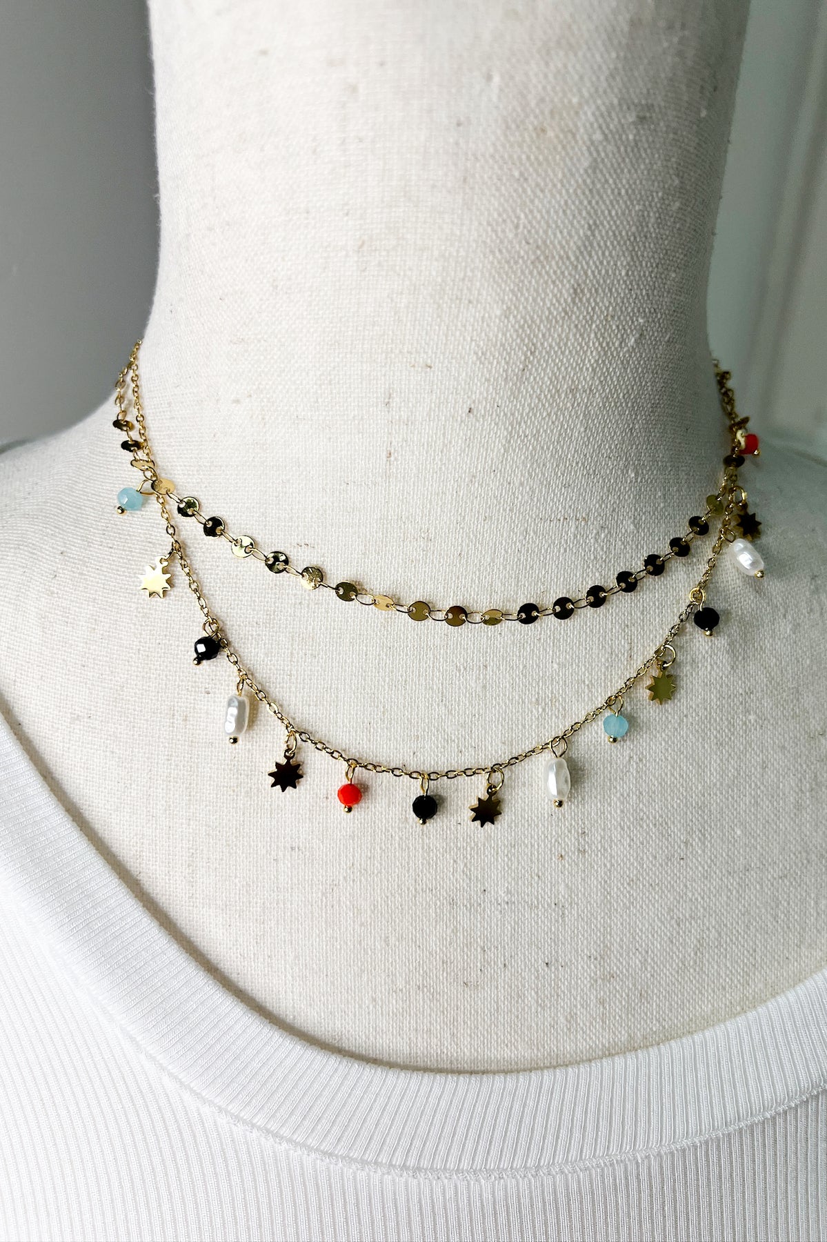 Shine bright with this Celestial Charm Layered Gold Necklace, featuring two delicate chains adorned with gold starbursts, colorful beads, and pearl accents. The layered design adds effortless dimension, while the celestial-inspired charms bring a dreamy, boho-chic vibe. Perfect for dressing up a simple top or adding flair to a night-out look, this necklace is a must-have statement accessory.