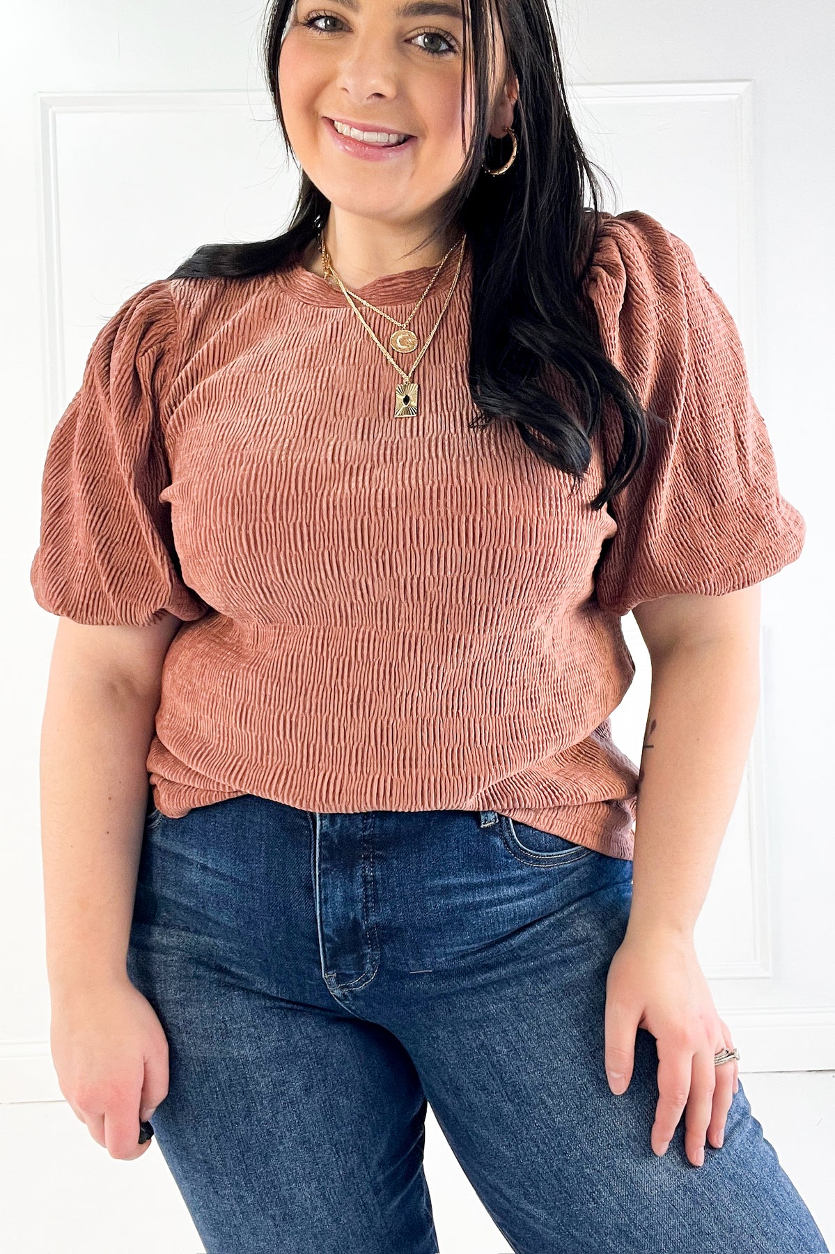 This textured knit top features subtle checker detailing and soft balloon sleeves that add an easy, feminine touch. The relaxed silhouette makes it an everyday staple with just enough structure to feel polished.