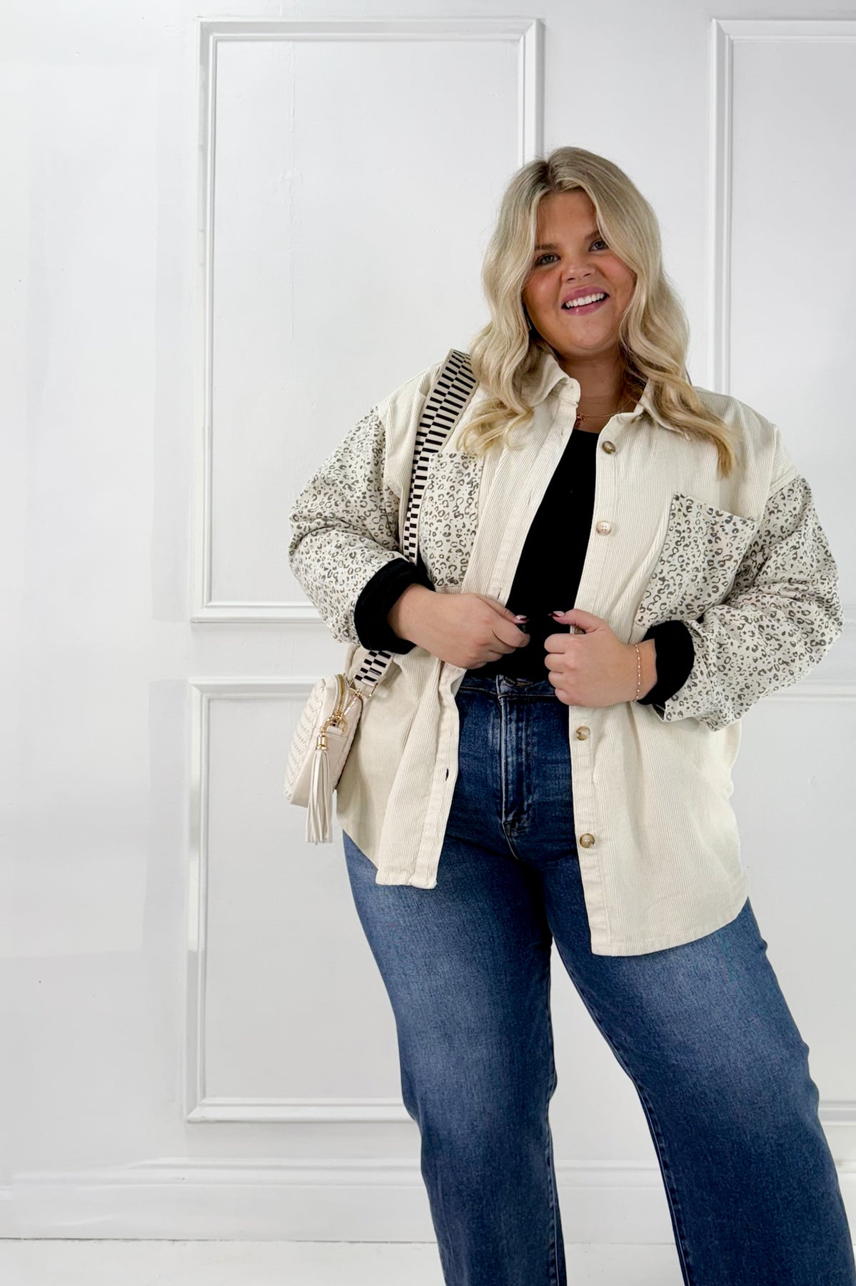 This shacket blends soft corduroy with bold animal print twill for a trendy contrast. Its relaxed fit and button-down style make it a versatile layering piece for casual outfits.