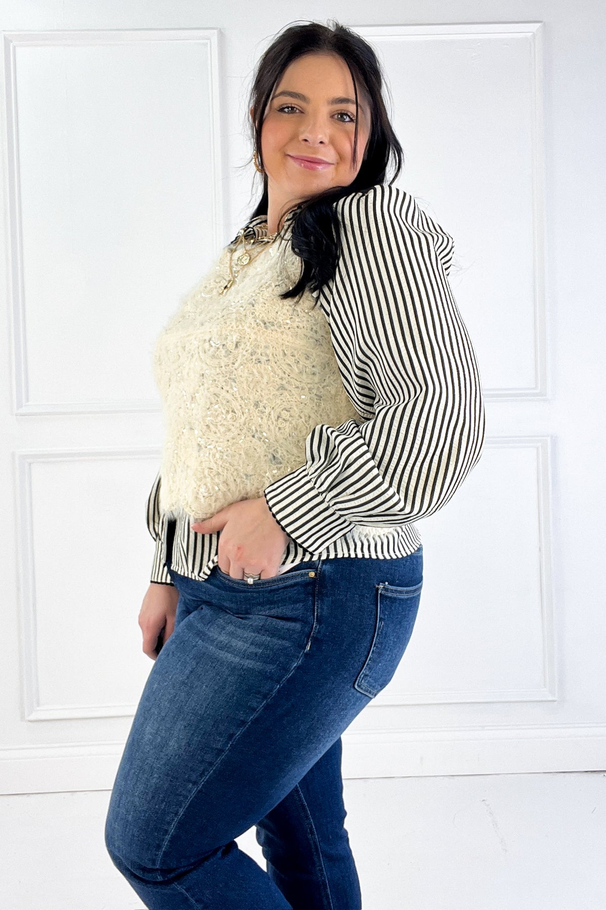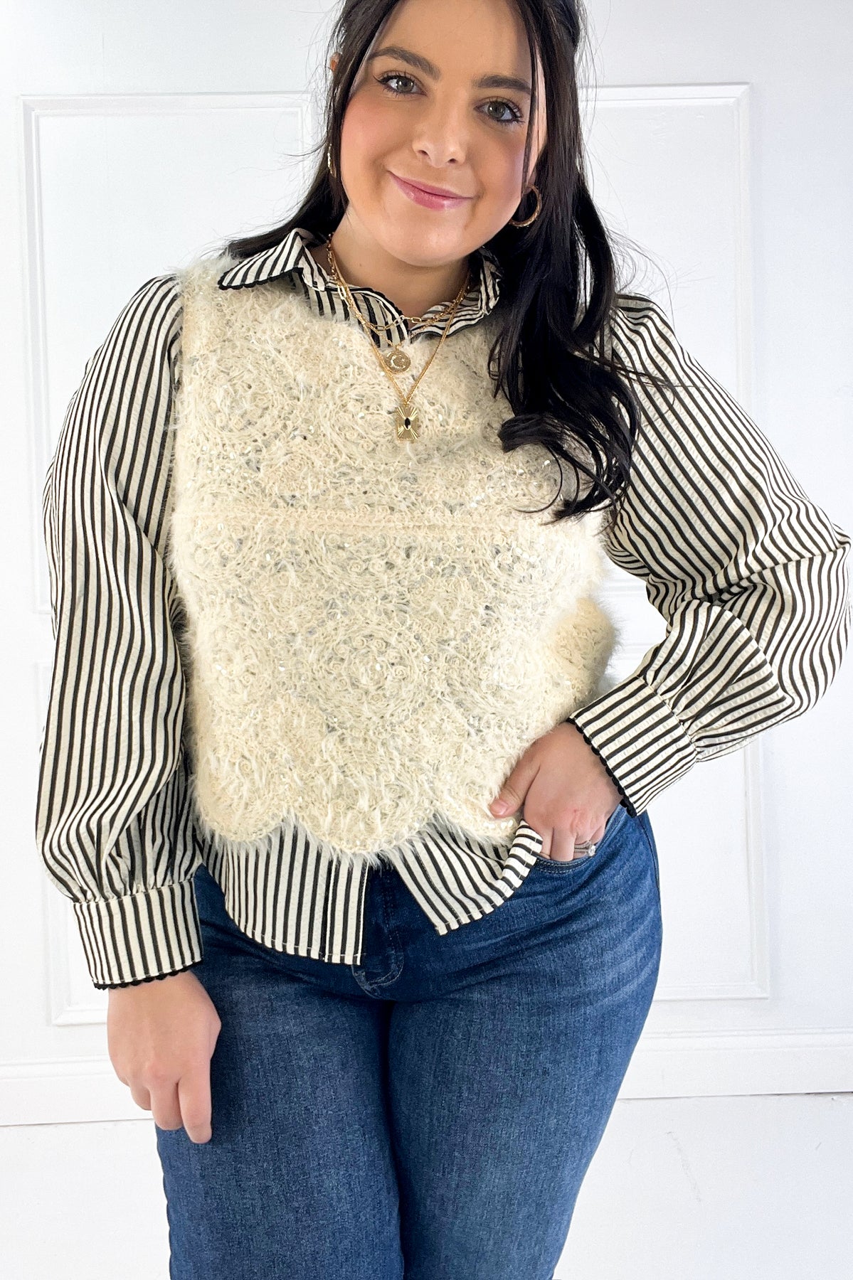 This tank blends soft eyelash knit texture with scattered sequins for a pretty, dimensional finish. The scalloped hem adds a playful touch that makes it feel instantly special.