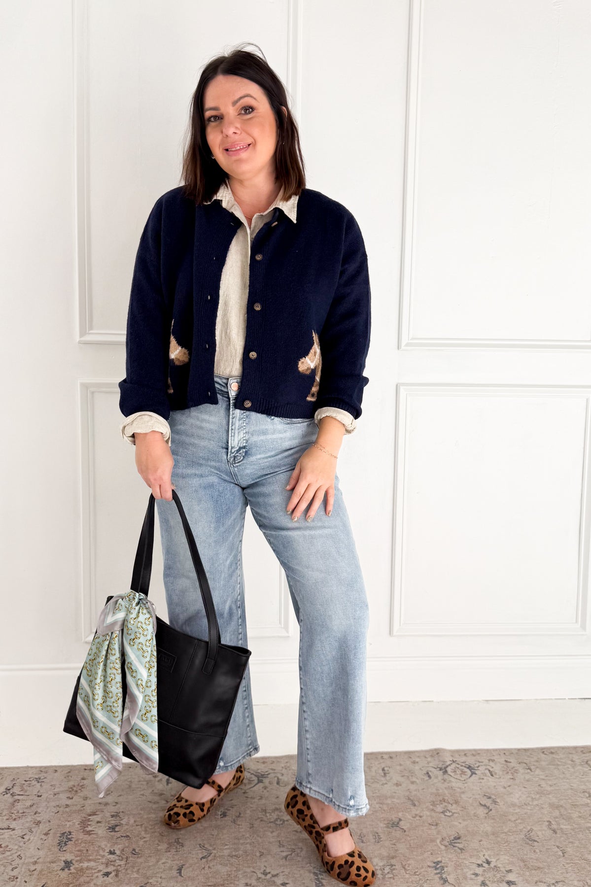 This button down cardigan features a charming horse jacquard design that adds a playful, rustic touch. With its soft knit and relaxed fit, it’s an easy layering piece for casual days or cozy evenings.
