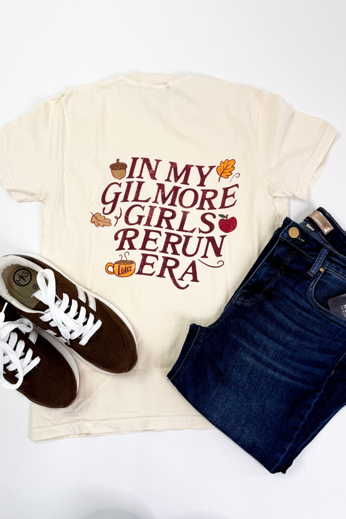 Cozy up for your next Stars Hollow marathon in this playful graphic tee. Featuring a bold fall-inspired print that reads “In My Gilmore Girls Rerun Era” with charming autumn icons, this soft cotton tee captures the perfect nostalgic vibe. A must-have for any fan embracing cozy seasons, coffee breaks, and rerun binges.
