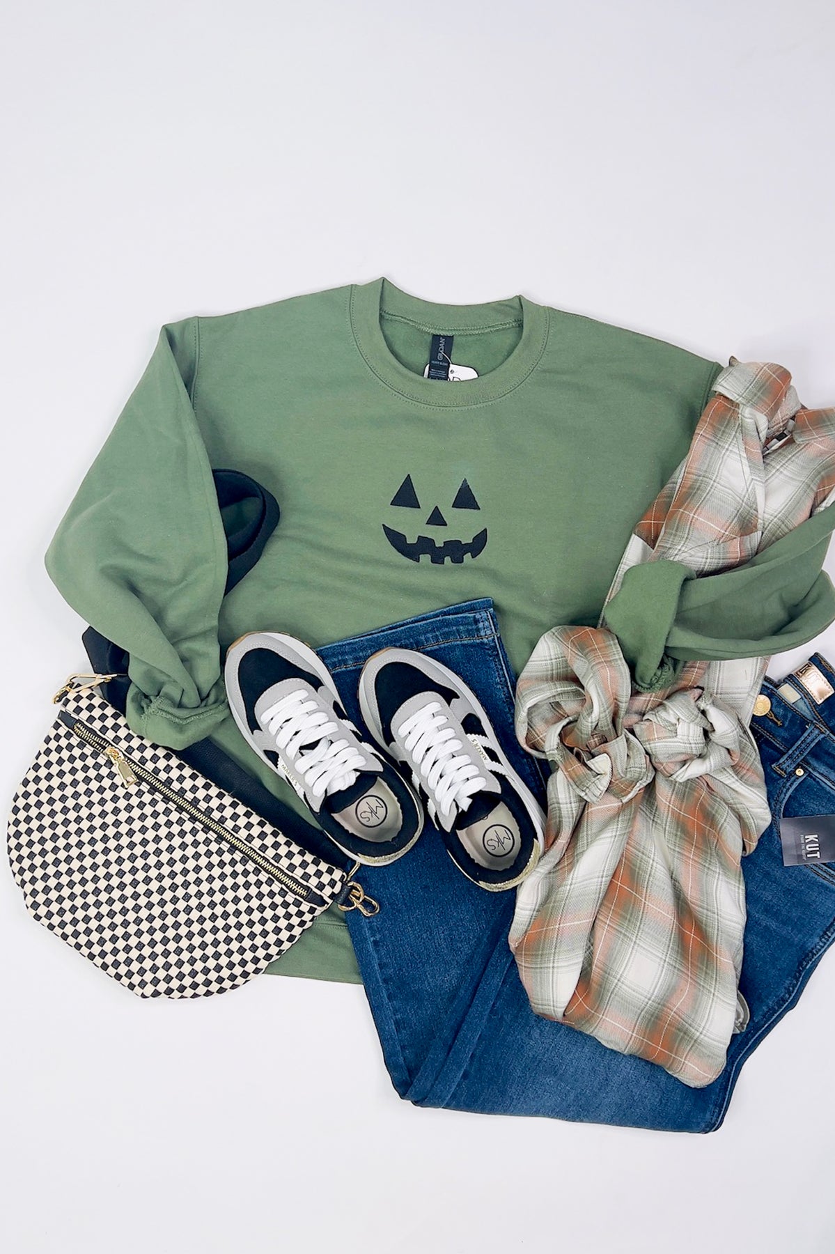A cozy seasonal sweatshirt featuring an embroidered jack-o’-lantern face at the center. The subtle stitching adds texture and charm, making it a festive yet casual piece for autumn wear.