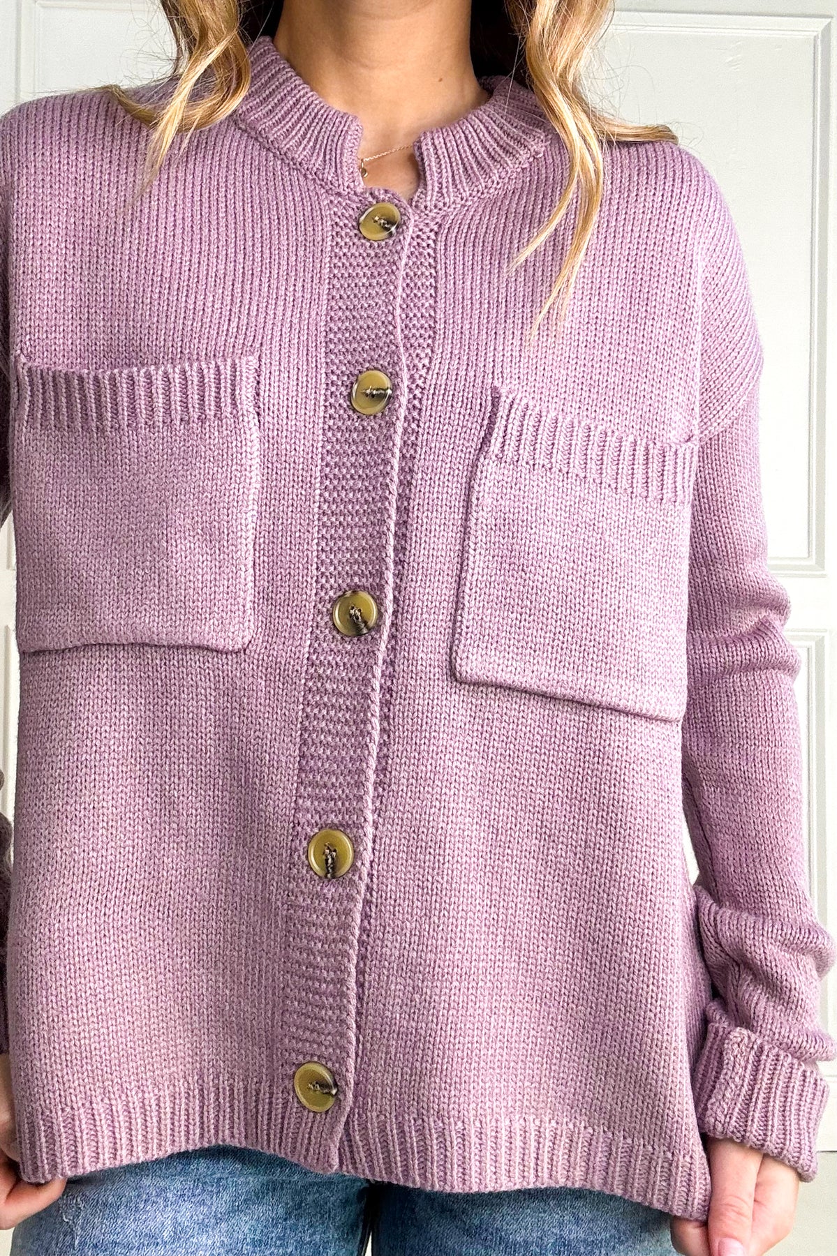 This structured sweater cardigan features a mock collar, front button closure, and functional chest pockets. The knit fabric offers both softness and structure for an easy, put-together layer.