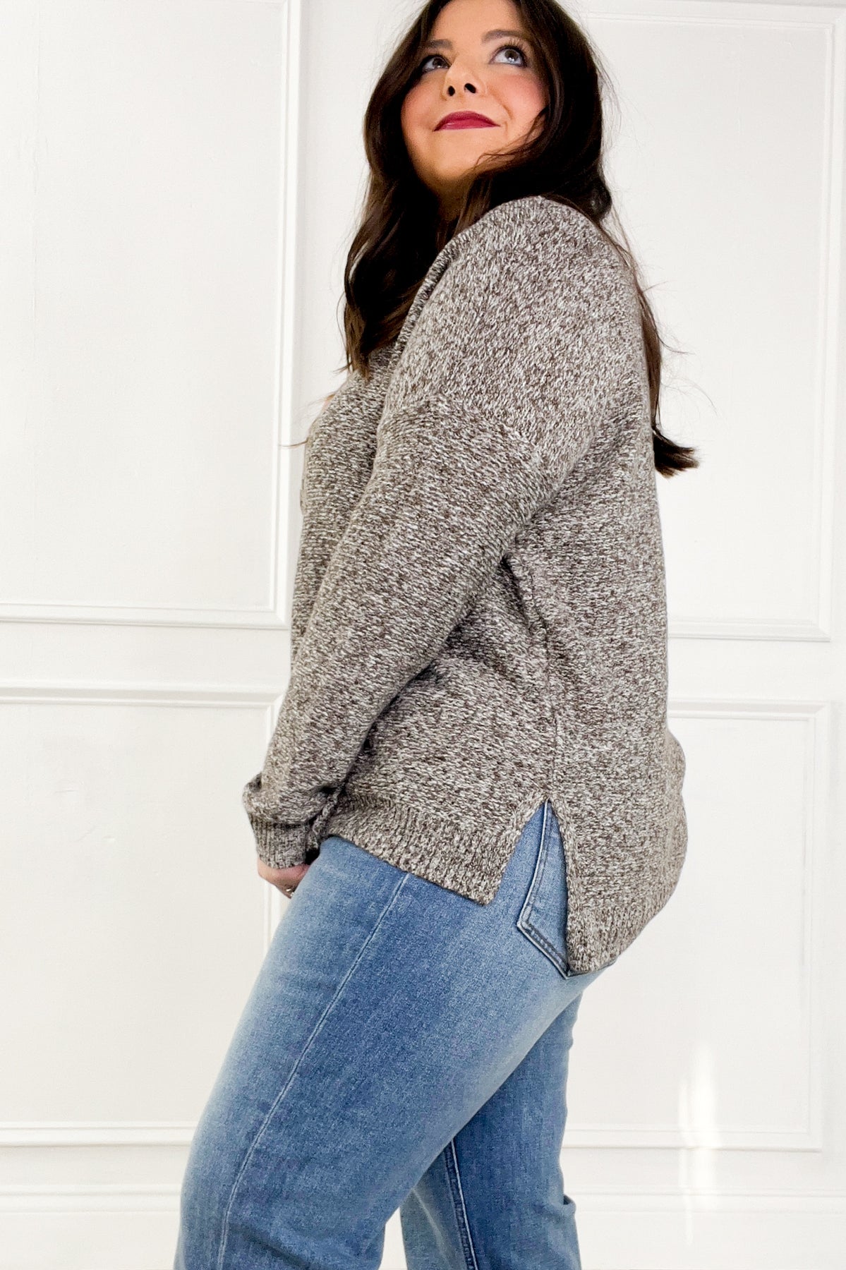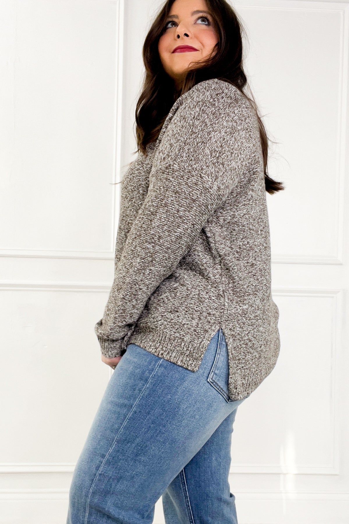 A marled knit sweater with a boxy silhouette and side slits for ease of movement. The mock neck and long sleeves give it a classic, timeless look with just the right amount of texture.