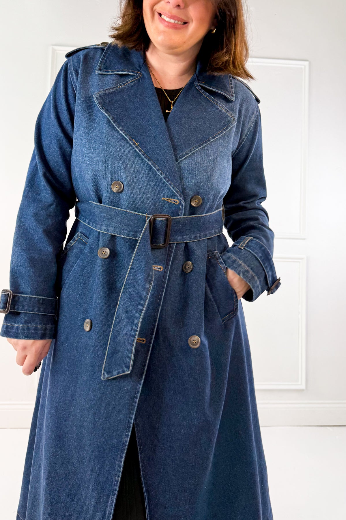 This denim trench coat features a structured notch collar for a polished, modern look. Its longline silhouette and classic trench details make it a versatile layering piece for every season.