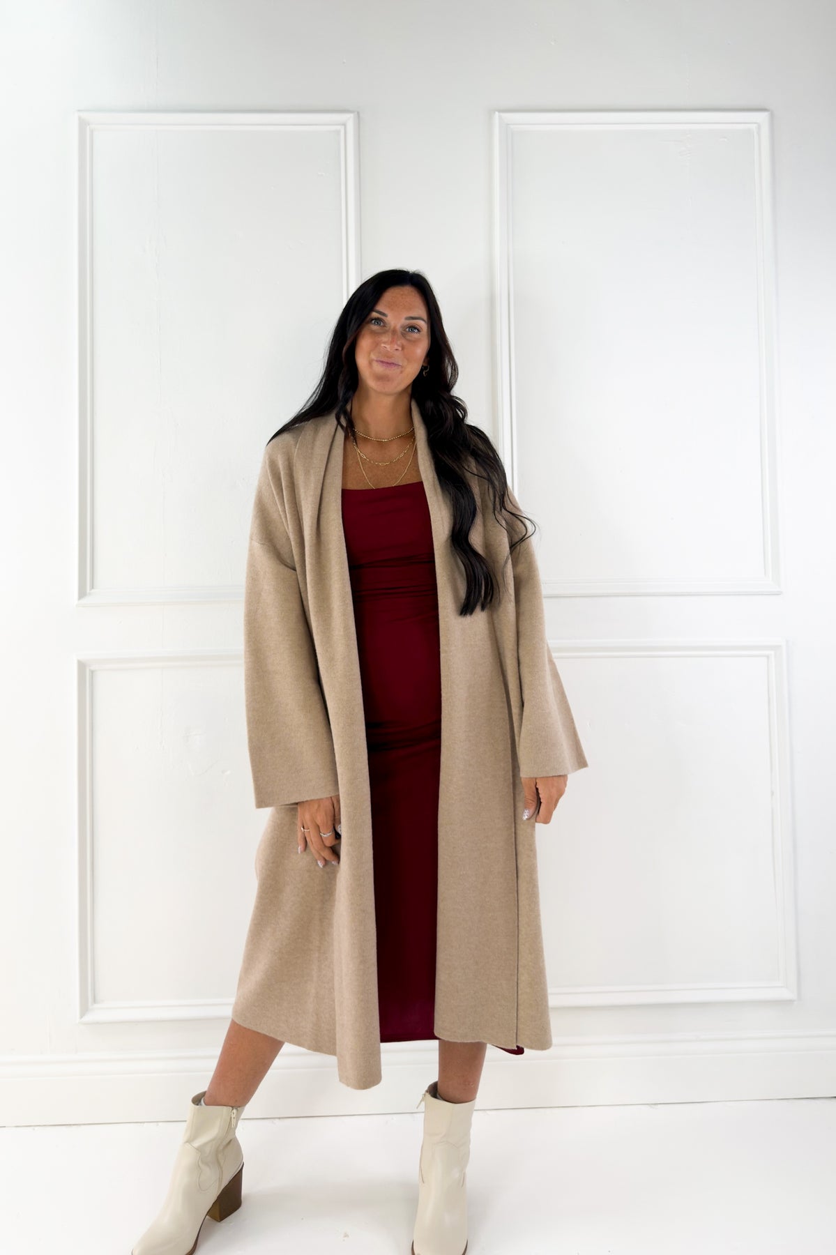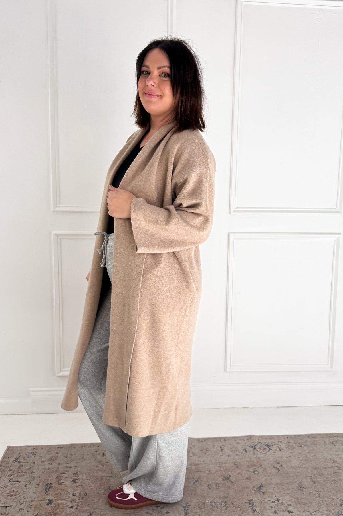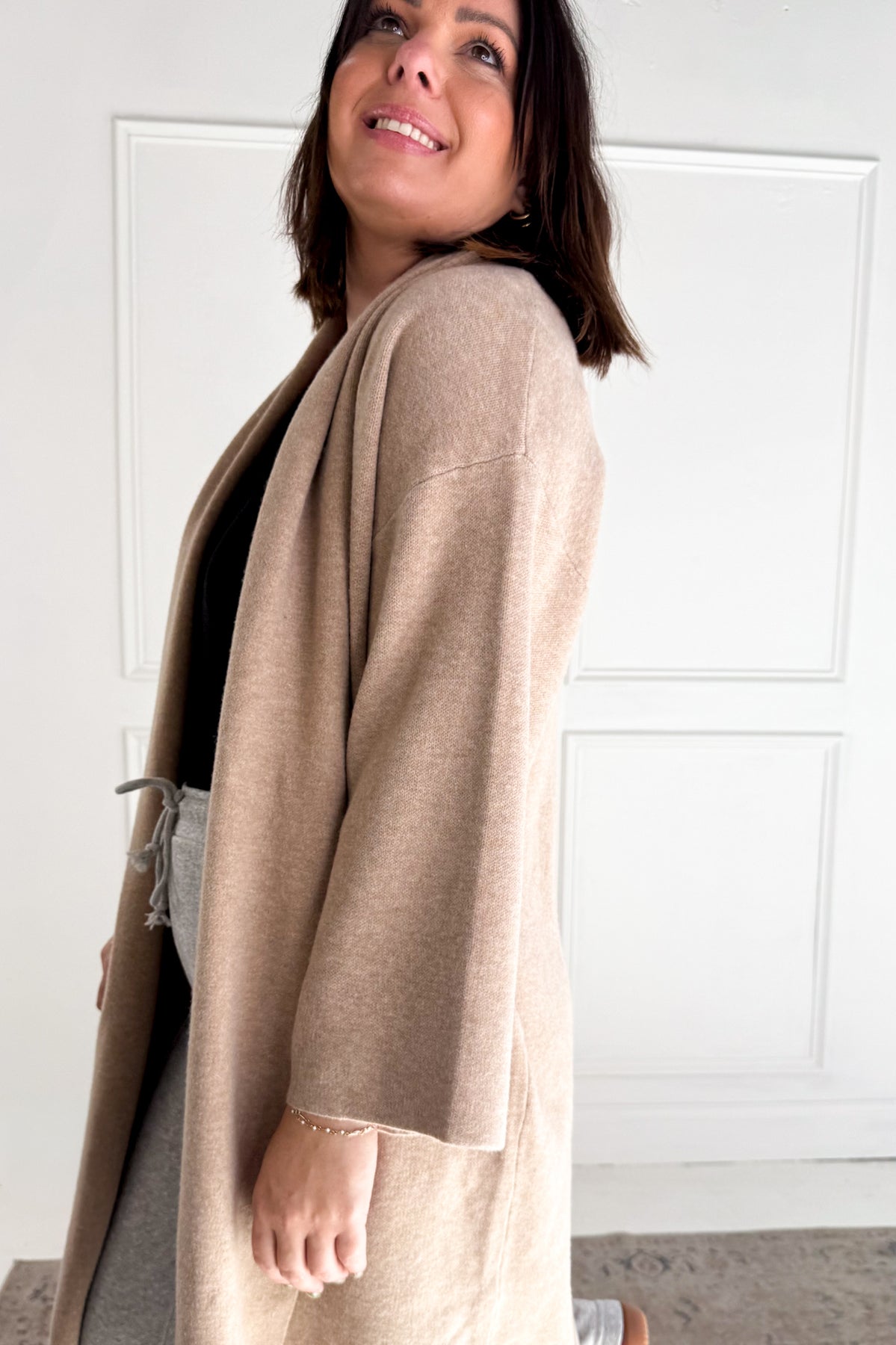 This open-front long line knit cardigan coat is the perfect layering piece, offering a sleek silhouette with a relaxed drape. Designed with side pockets and a versatile length, it transitions effortlessly from casual denim days to polished office looks.