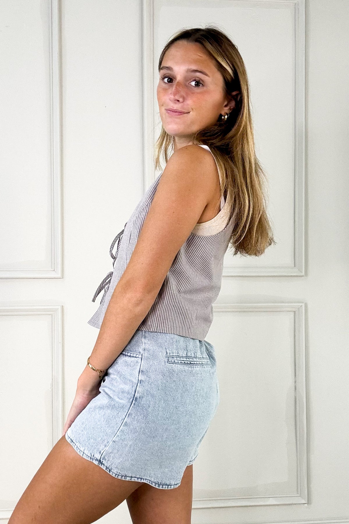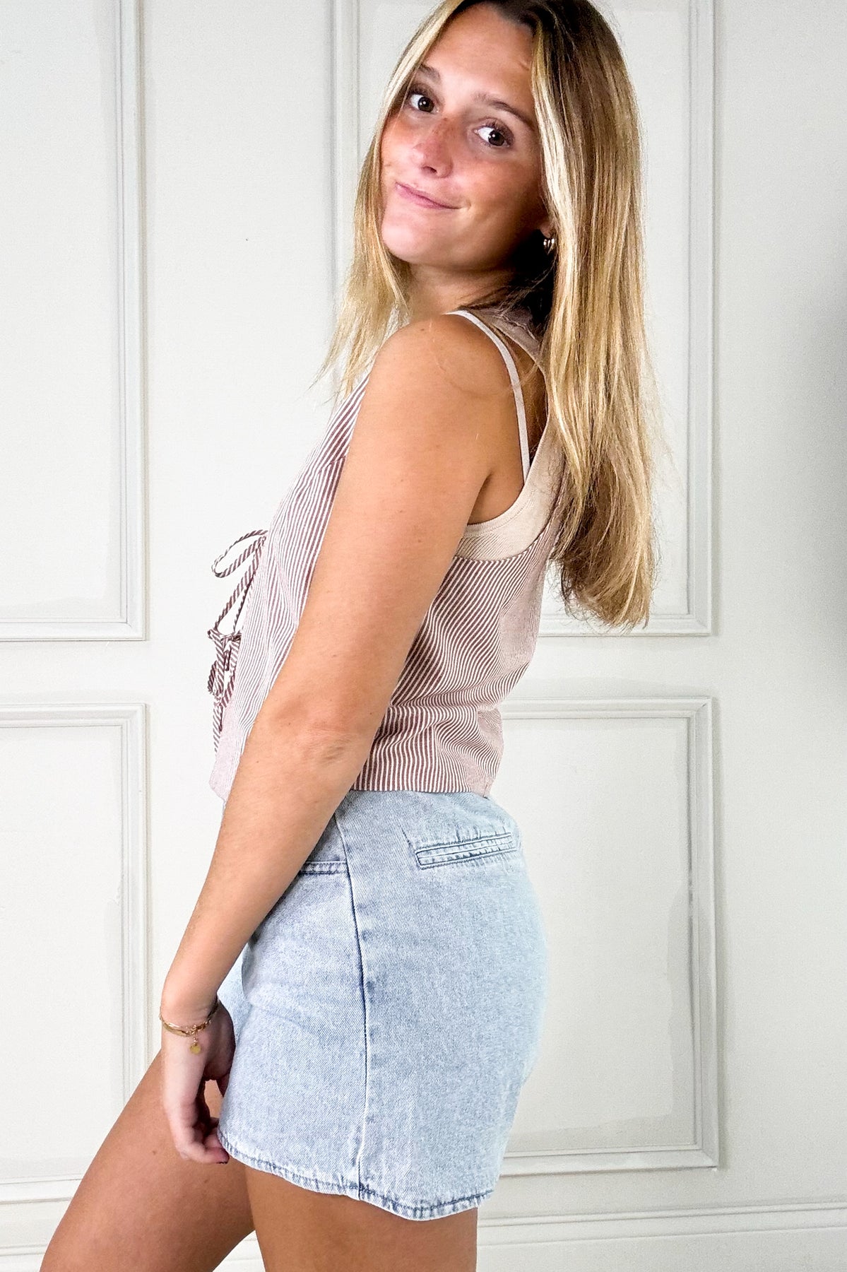 Sweet meets structured in this cotton pinstriped vest featuring a cropped cut and double front tie closures. The sleeveless, V-neck design adds a playful layer to your summer lineup—just toss it over a tank or wear it solo for a tailored, sunny-day vibe.