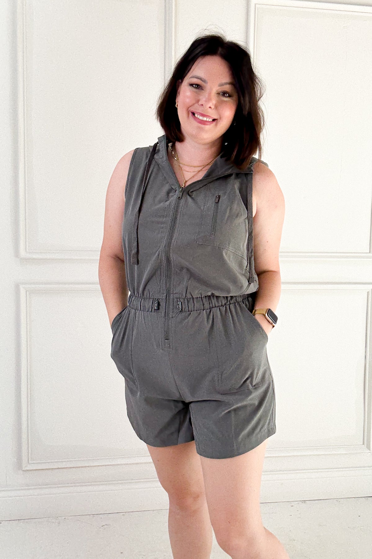 Poly Stretch Woven Hoodie Sleeveless Romper