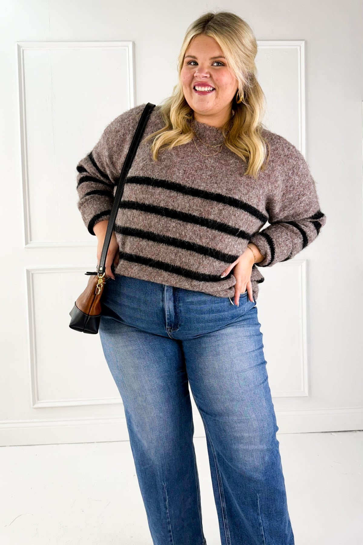 This fuzzy striped sweater has a soft, brushed feel with relaxed lines that give it an easy, laid-back look. The wide stripes add a little pop while keeping the vibe minimal and cozy.
