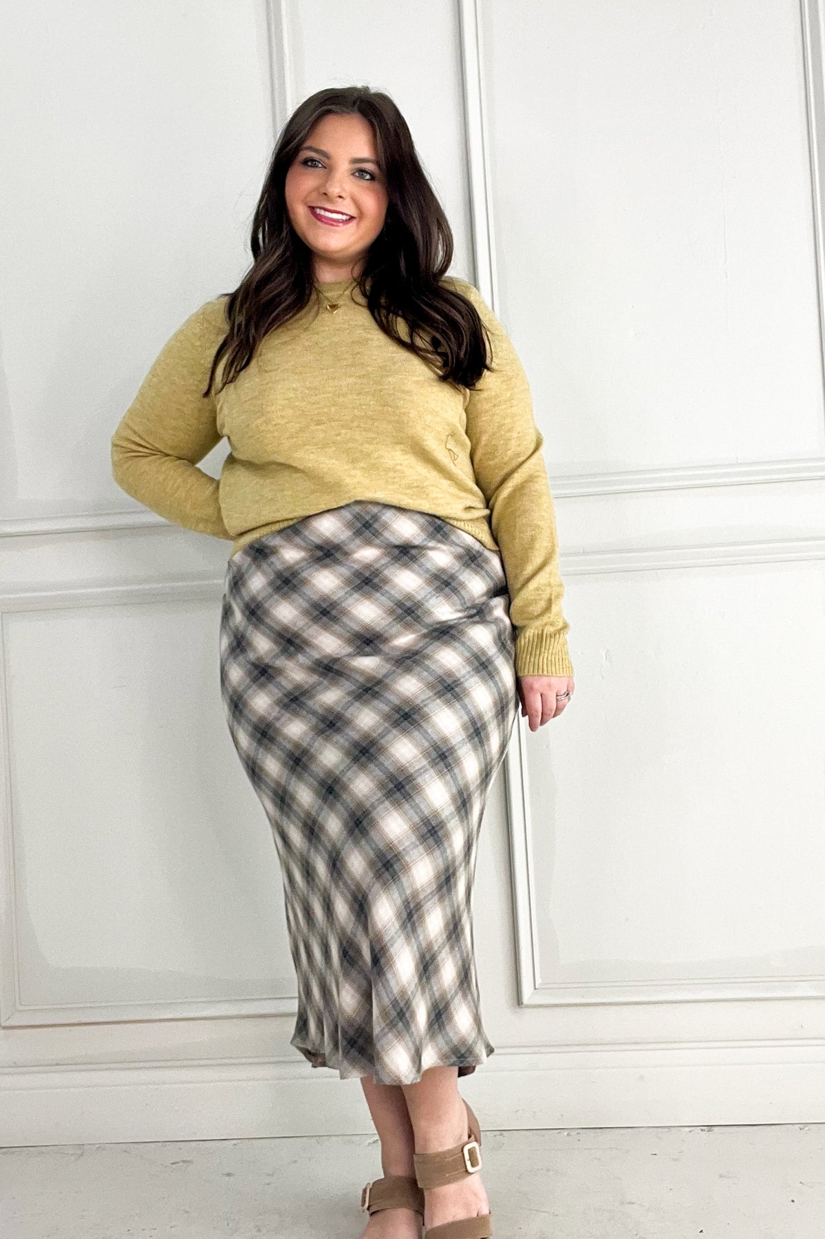This lightweight midi skirt flows beautifully with every step, featuring a classic tartan plaid design and an easy, comfortable fit. Perfect for pairing with knits or tees year-round.