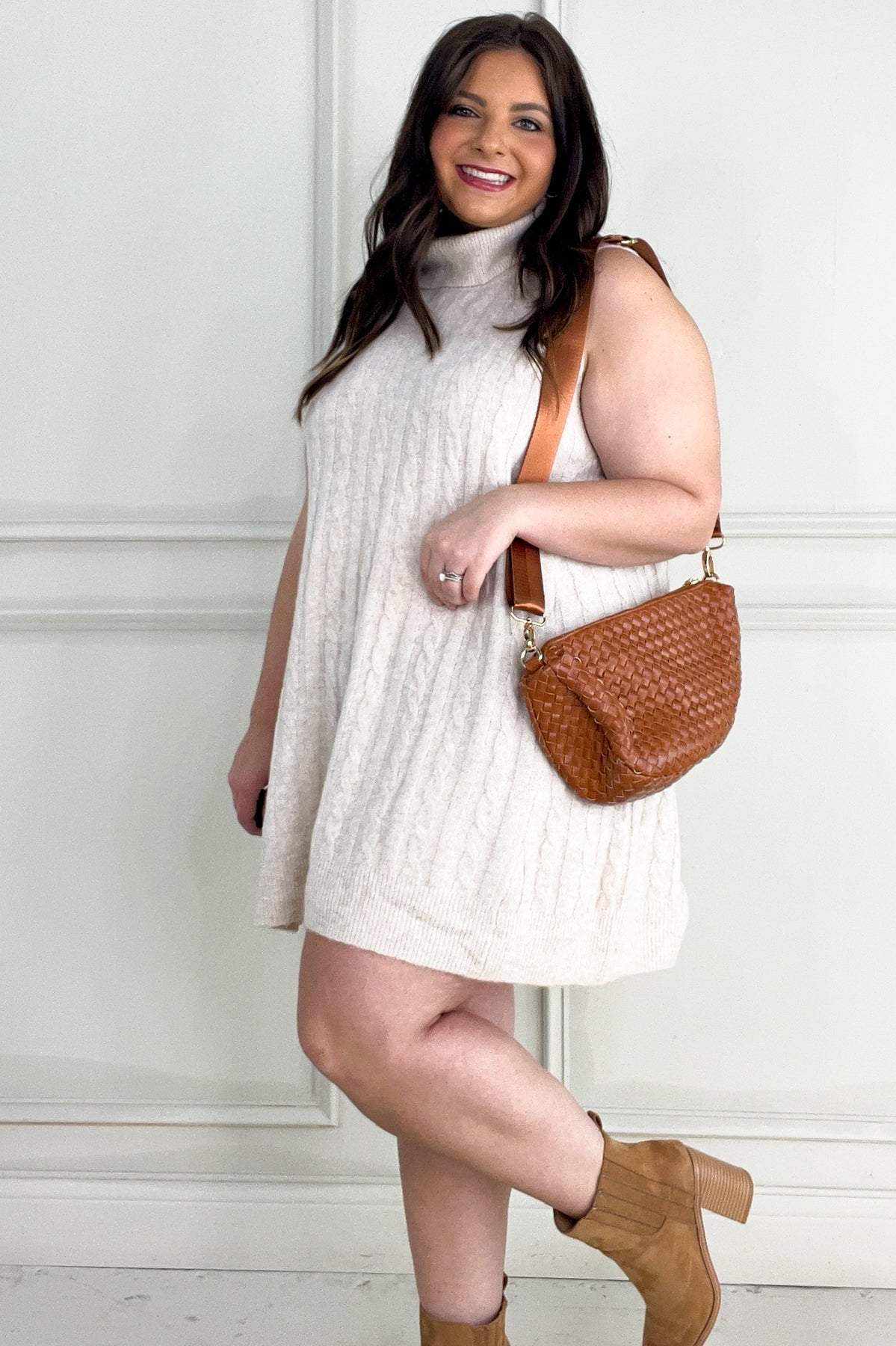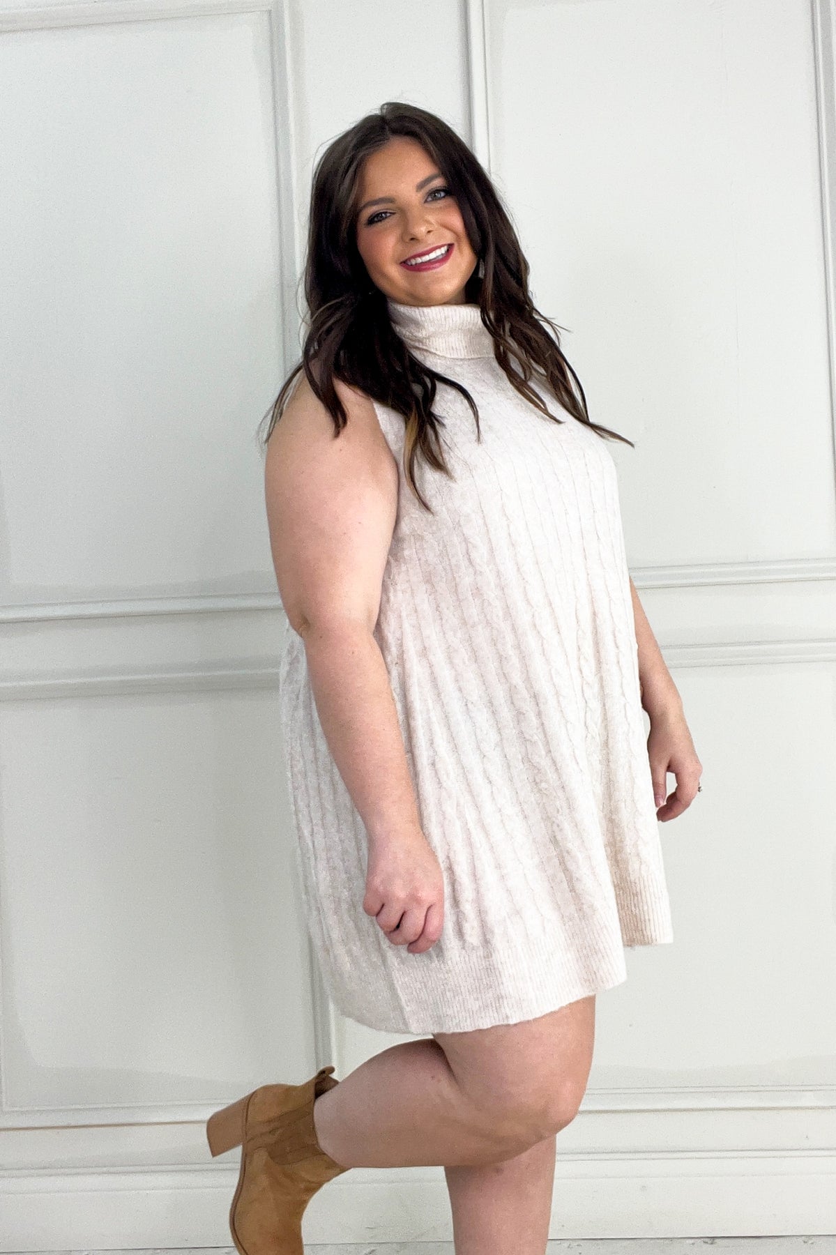 This longer-length sweater vest features a chunky cable knit and a cozy turtleneck, making it ideal for layering over tops or dresses. The tunic cut offers extra coverage and a flattering drape.