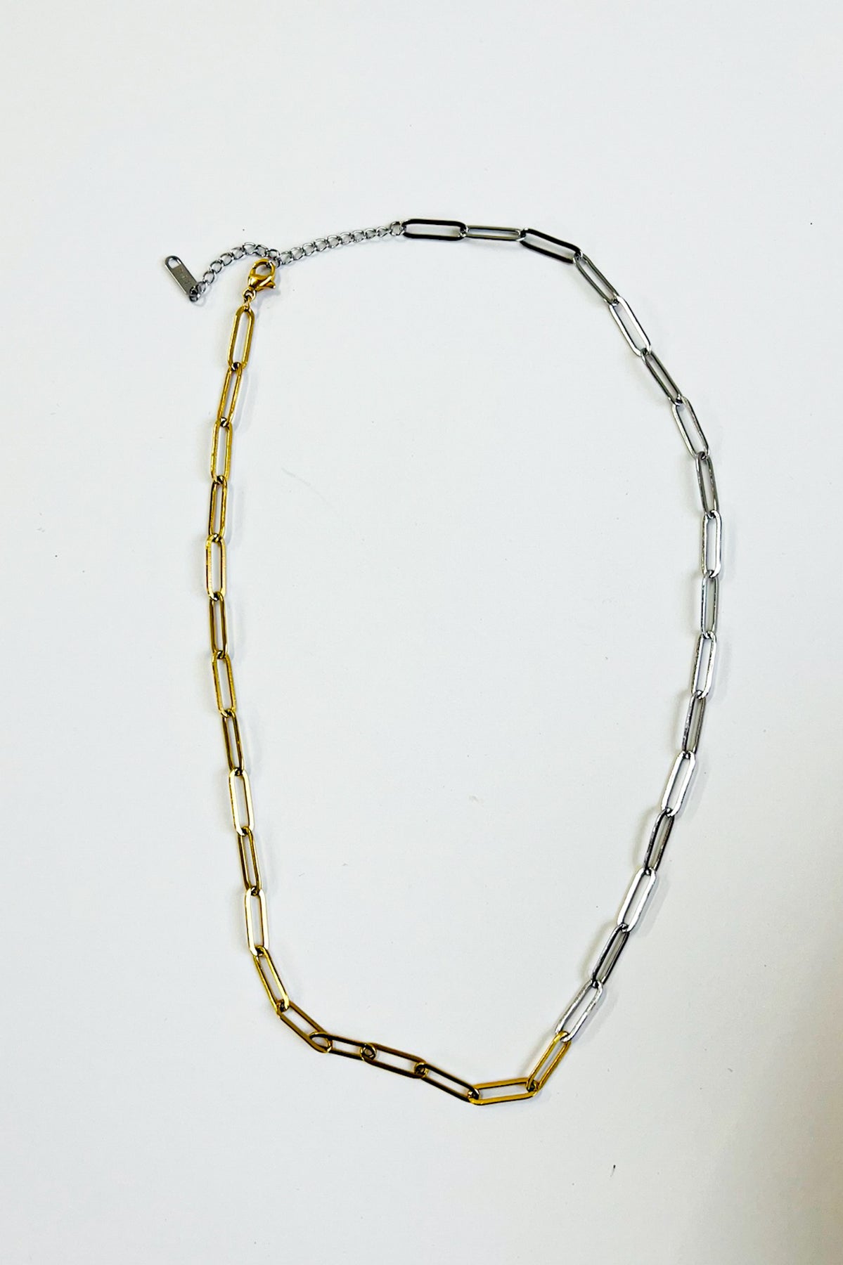 This two-tone chain necklace blends bold gold and sleek silver in a modern link design that makes a statement without saying a word. Crafted from durable stainless steel and dipped in real 18K gold, it's tarnish-resistant, hypoallergenic, and fade-proof—just like your style.
