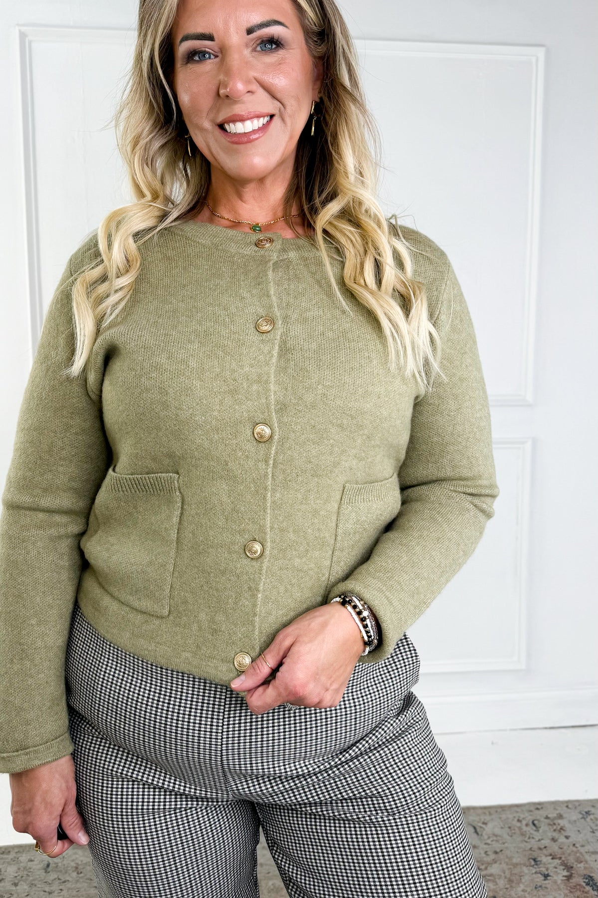 A refined take on a timeless staple, this cardigan is crafted from a soft wool-blend knit and finished with polished gold-tone buttons. Its clean lines and classic design make it the perfect layer for both casual and elevated looks.