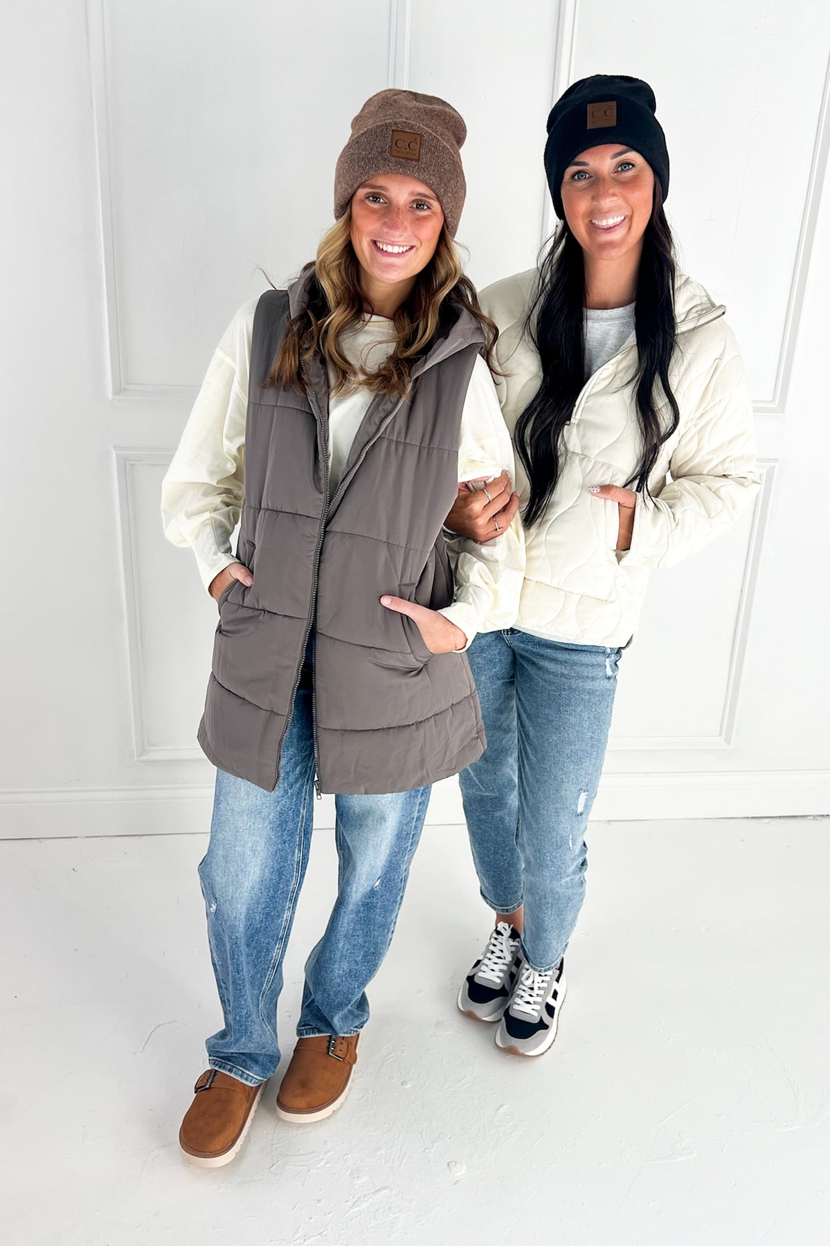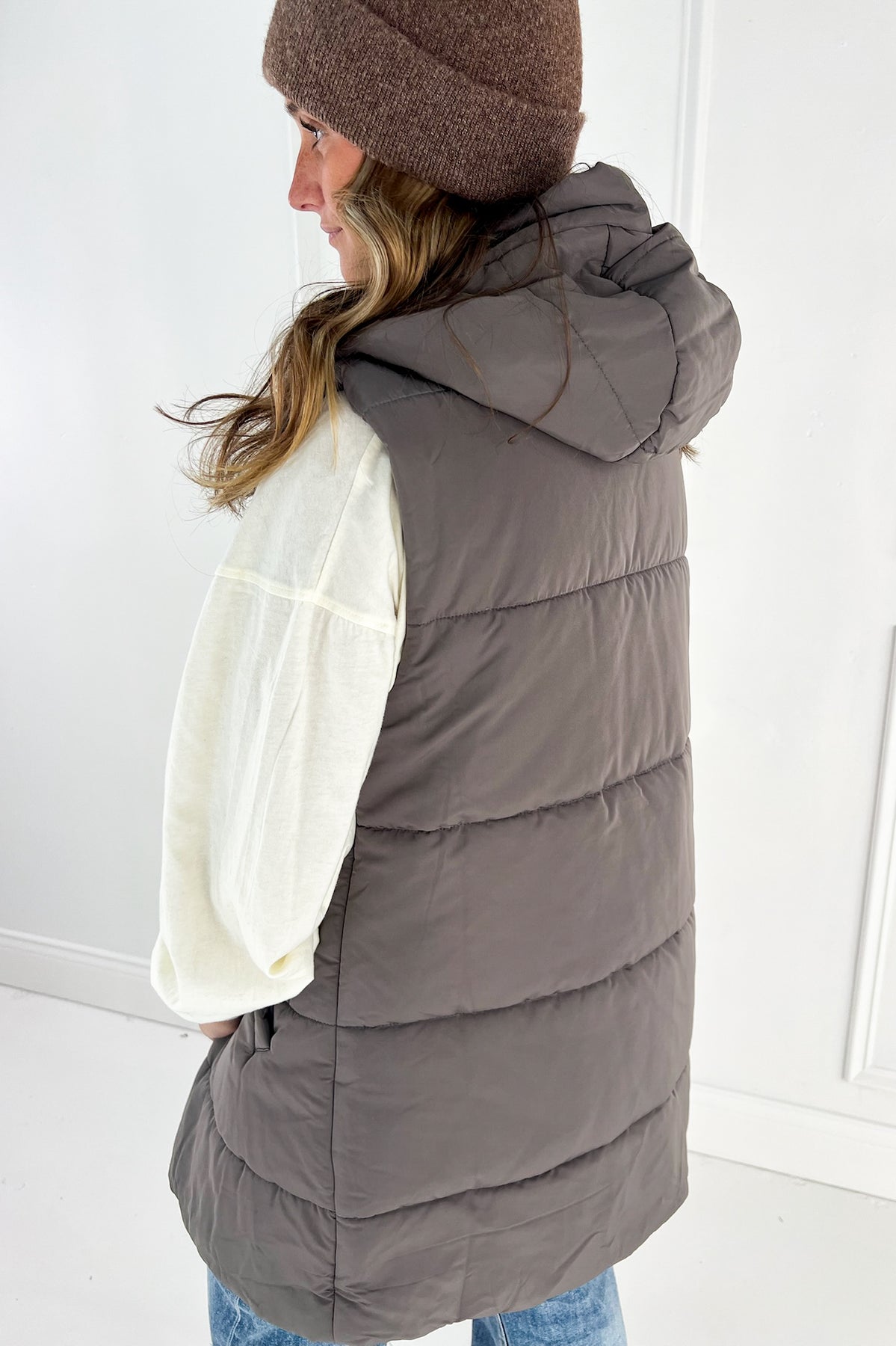 This longline puffer vest brings extra warmth without restricting movement. It features a zip front closure, an attached hood, and deep side pockets for everyday practicality, making it an ideal layering piece.