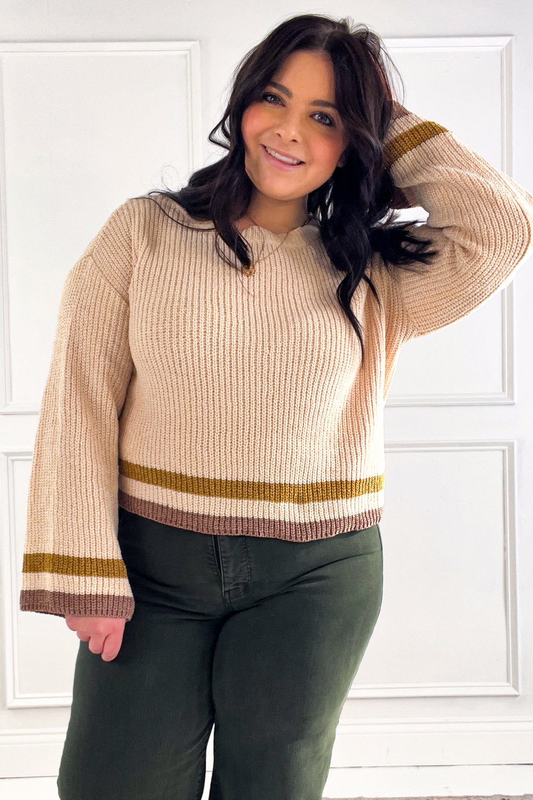 Striped Trim Ribbed Crewneck Sweater