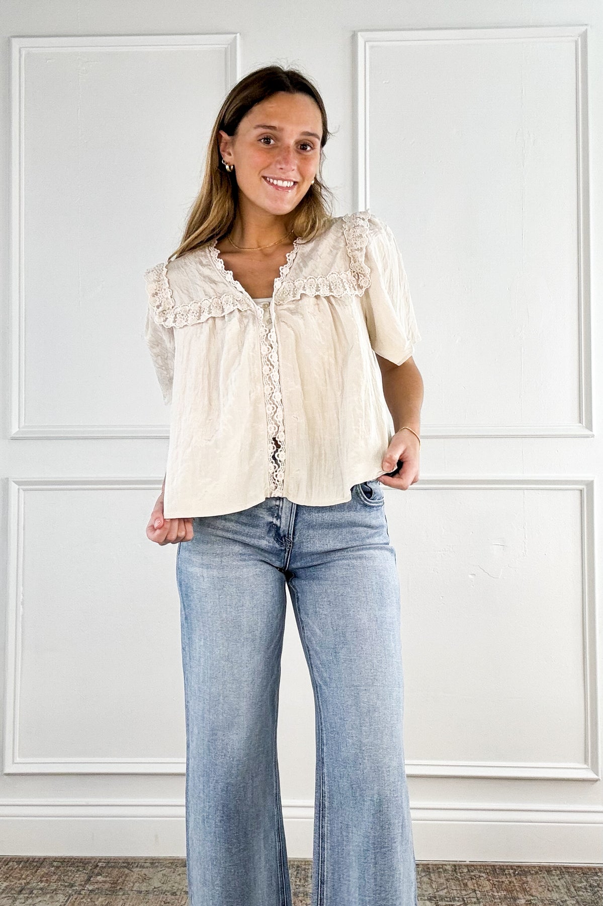 Button Down Lace Trim Blouse