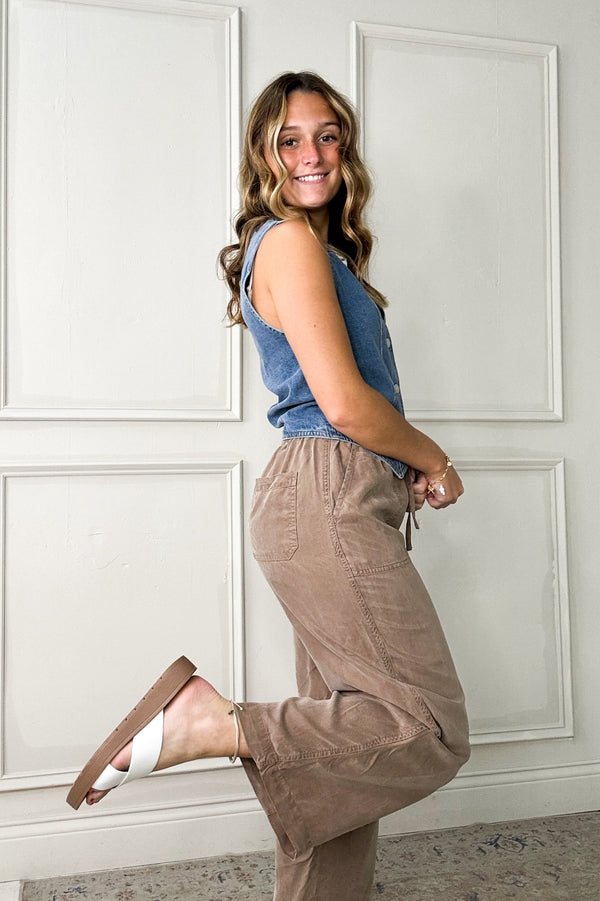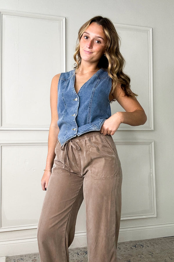 Lightweight and breezy, these wide leg pants are made from soft Tencel fabric with a high-rise, cropped fit that’s perfect for warmer days. The drawstring and elastic waistband add all-day comfort, while side and back pockets keep it practical.