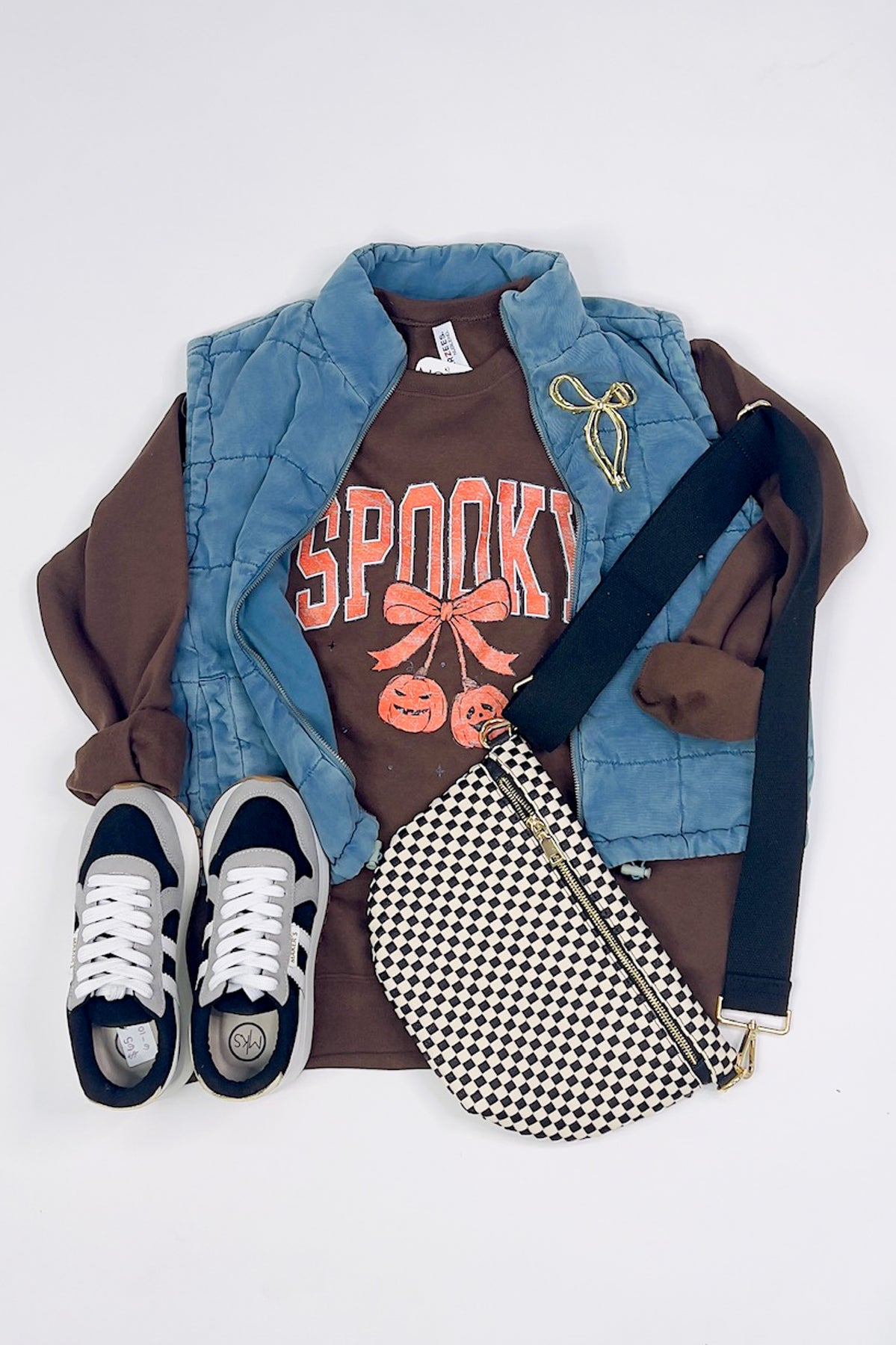 A fun Halloween sweatshirt featuring a bold “Spooky” graphic paired with a bow and dangling jack-o’-lanterns. The playful print gives it a festive feel, making it a great seasonal piece for casual wear.