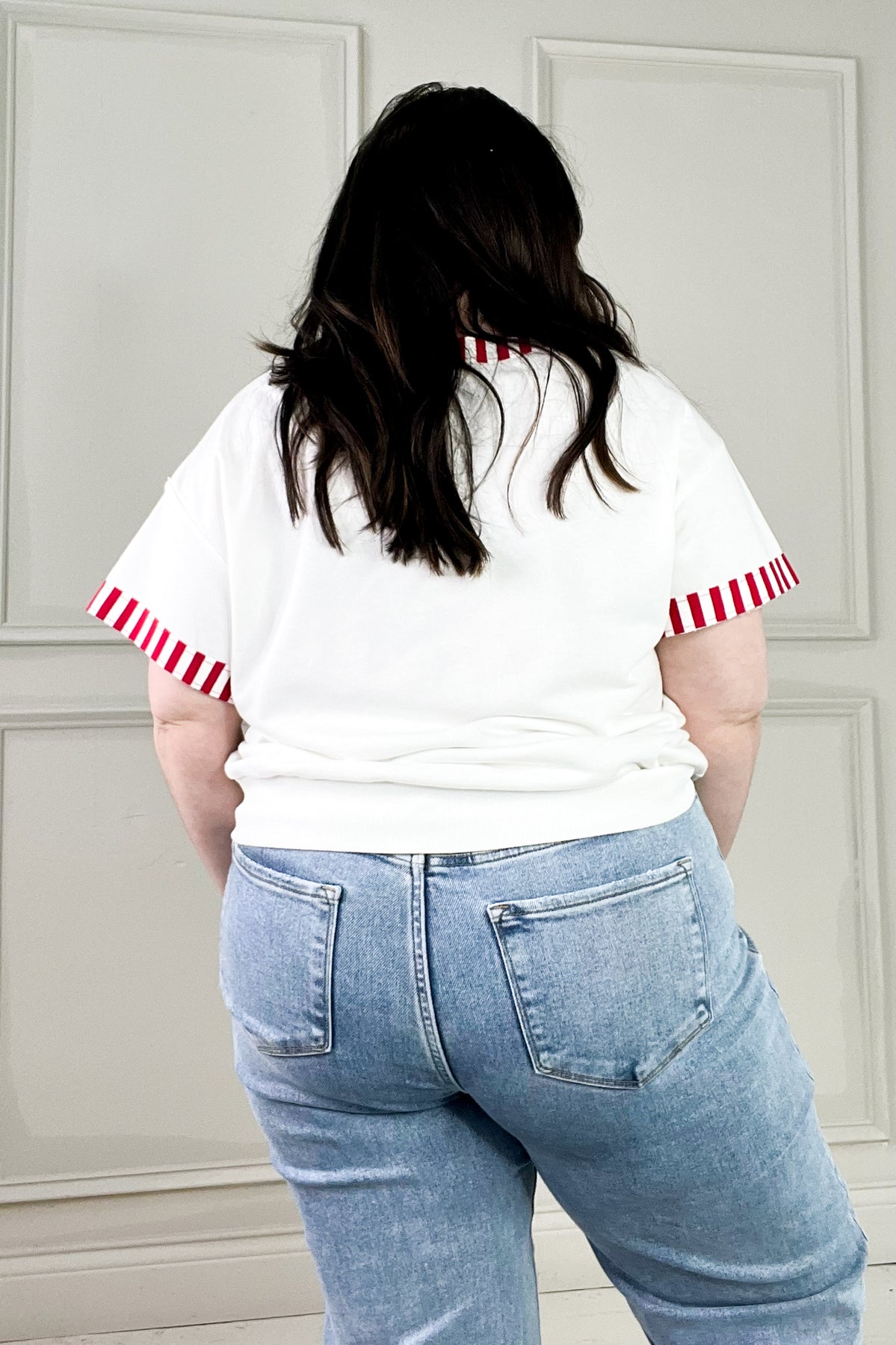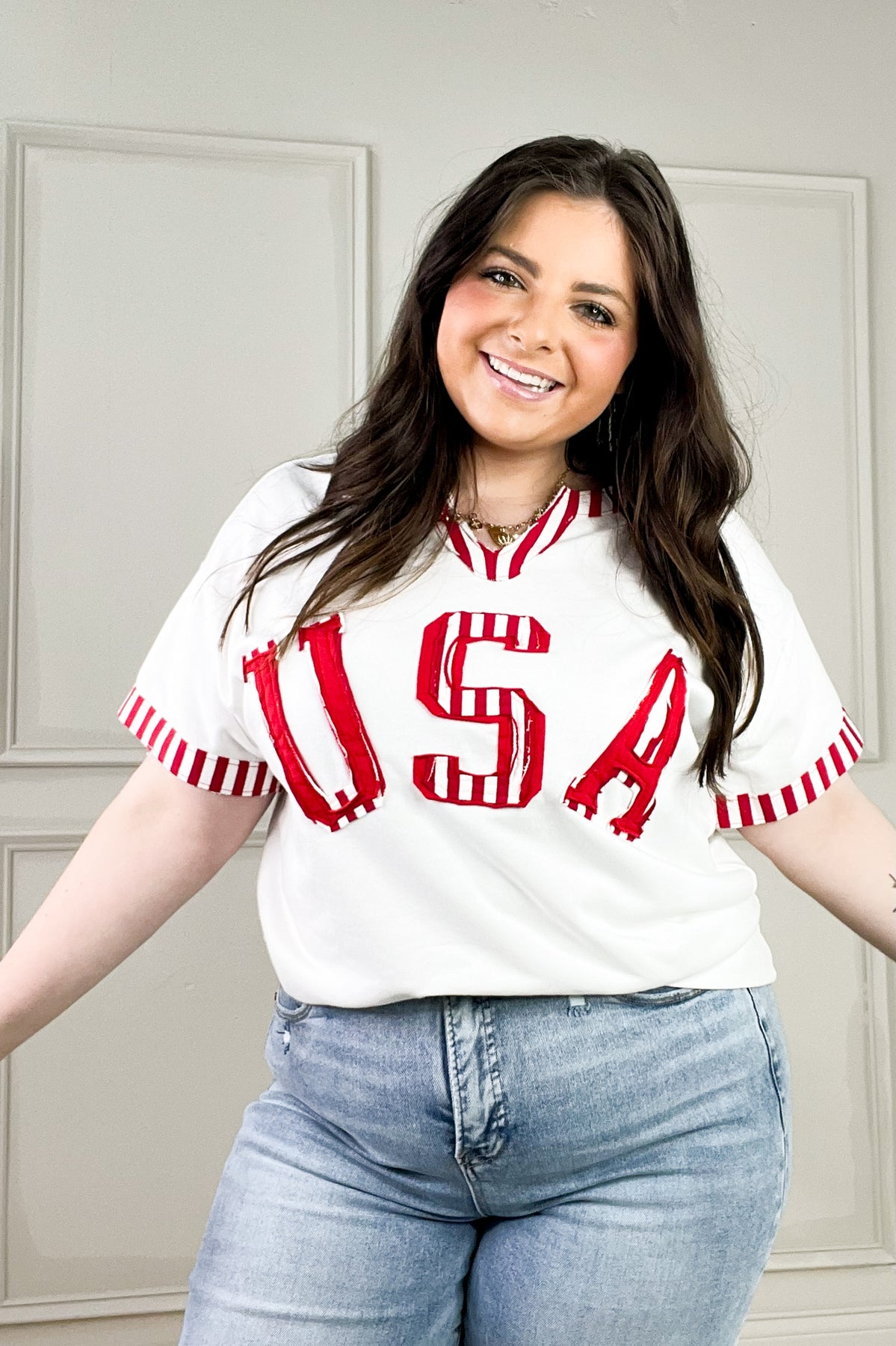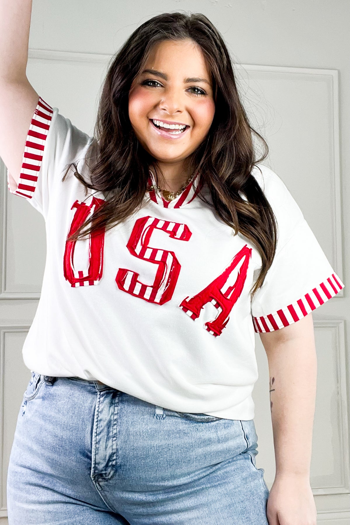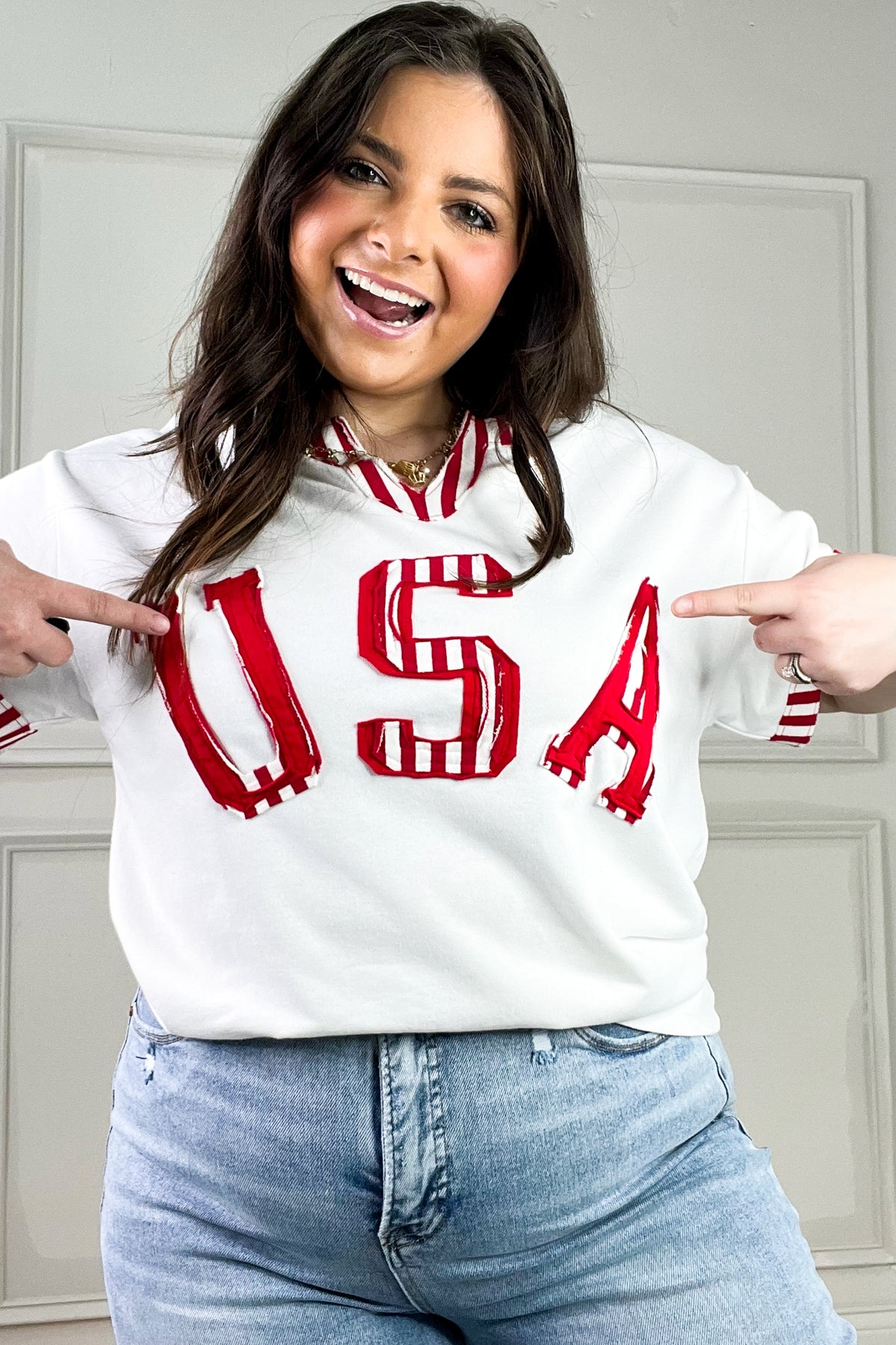 Relaxed and patriotic, this USA oversized tee features bold red striped details around the collar for a sporty touch. Soft, comfy, and perfect for laid-back summer days.