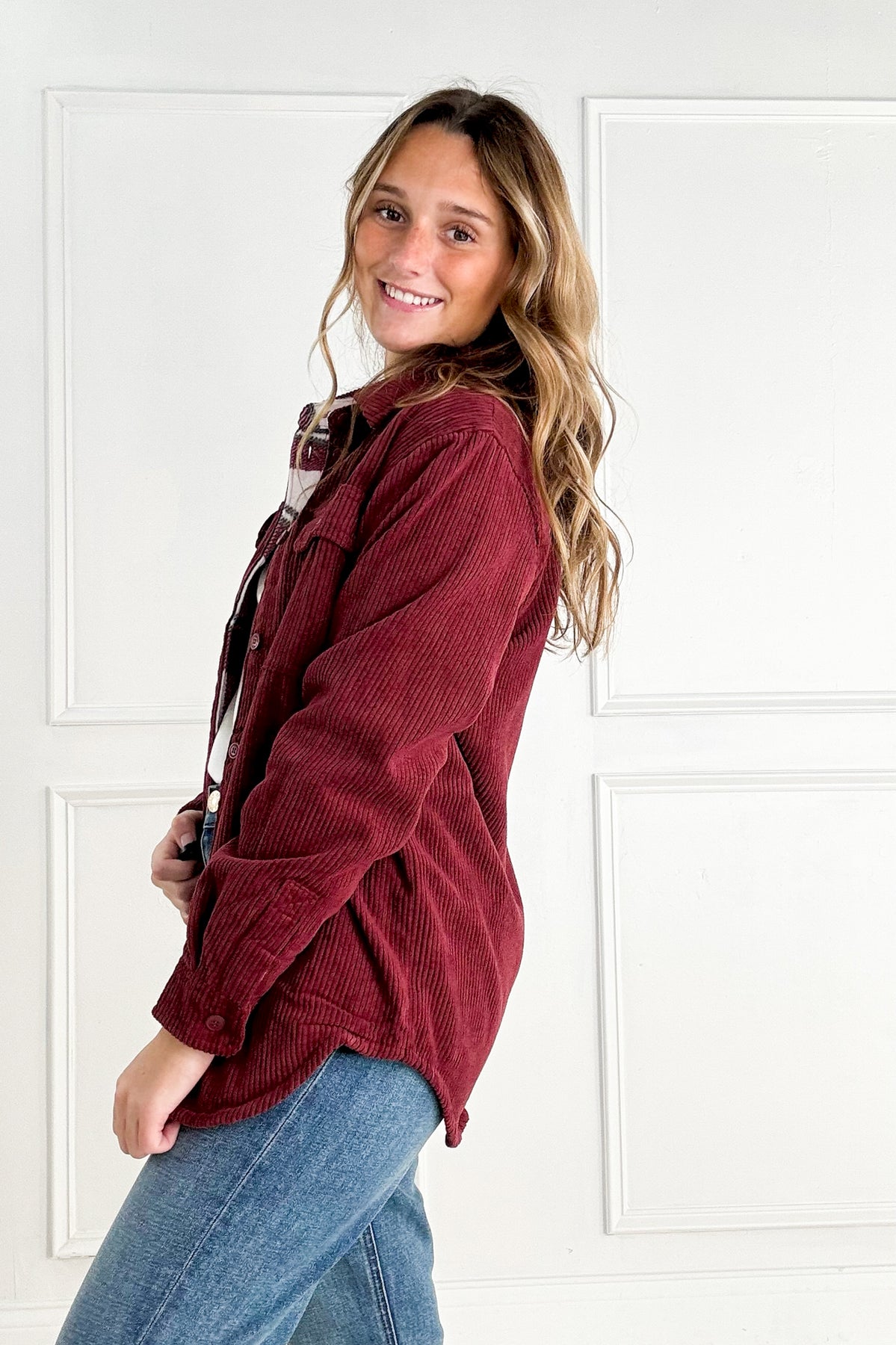 This jacket combines soft corduroy with a cozy plaid lining for the perfect layered look. With its button-down design, it’s versatile for wearing open or closed.