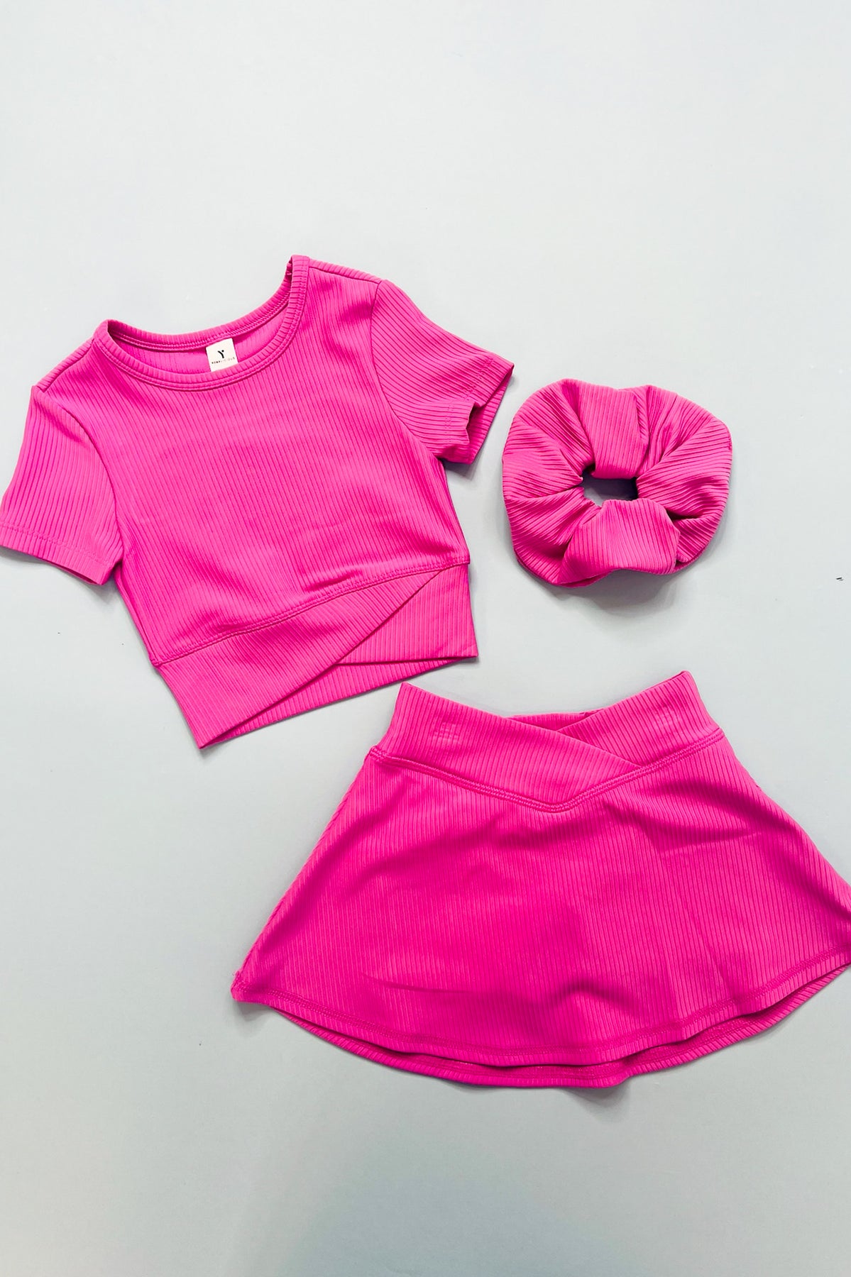 Sweet, comfy, and totally twirl-worthy! This adorable 3-piece set features a soft ribbed crossover top paired with a matching pink skort for the perfect mix of style and play. The ribbed texture adds a trendy touch while the skort gives her the look of a skirt with the comfort of built-in shorts—win-win! Perfect for playdates, parties, or everyday cuteness.