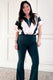 This one-piece wonder features a relaxed collared stripe top with a zip front and sleek flare bottoms for a look that’s equal parts sporty and pulled-together.