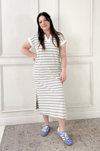 With its ribbed texture and classic white collar, this striped midi dress features a v-neckline, dolman short sleeves, and side pockets for easy everyday wear. A side slit adds movement and a casual, polished feel.