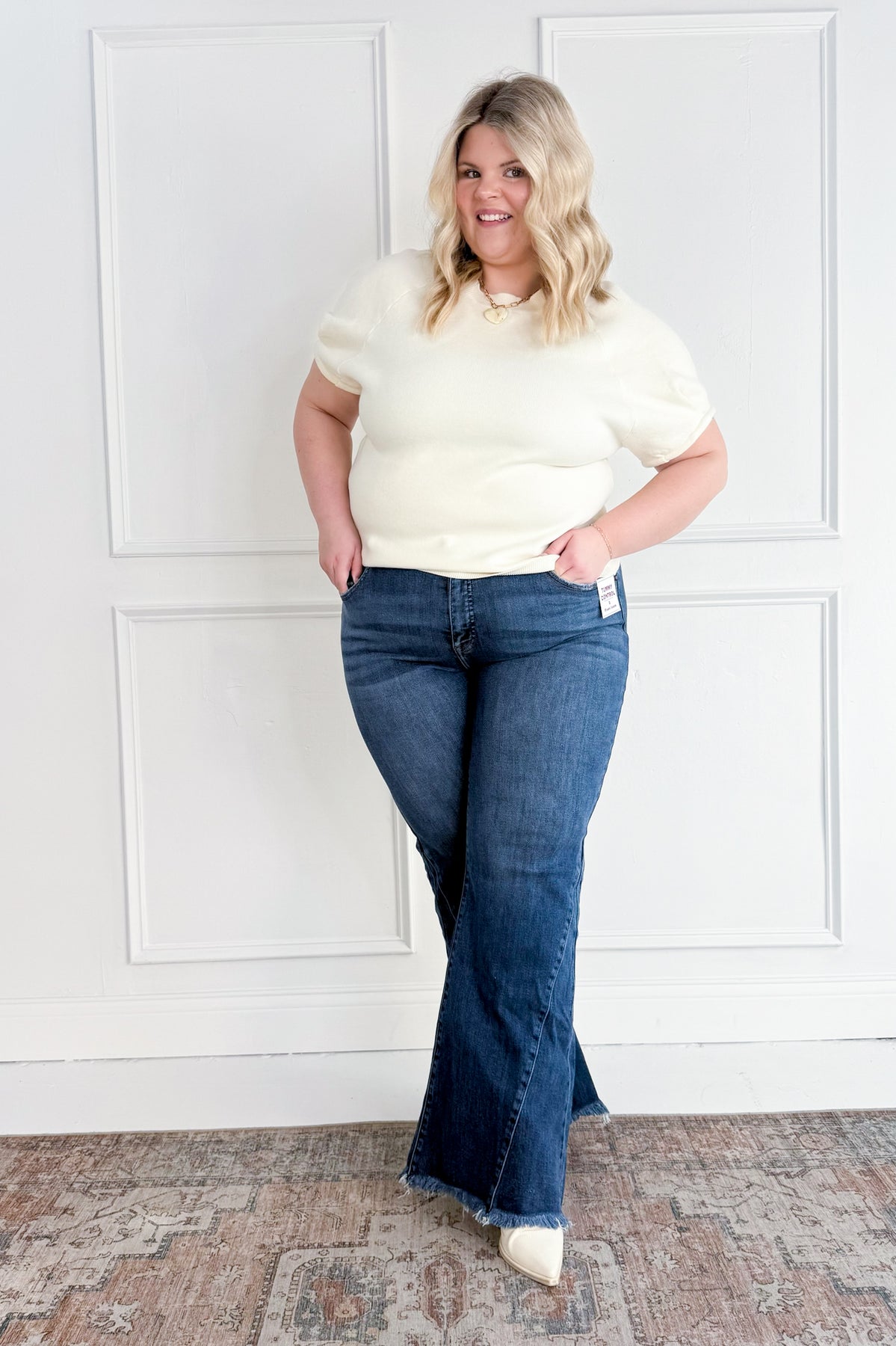 These mid rise flare jeans feature subtle side seam detailing that adds shape and visual interest without feeling overdone. The fit hugs through the hips before flowing into a relaxed flare, giving them a balanced, flattering silhouette that works effortlessly with fitted tops or soft knits.