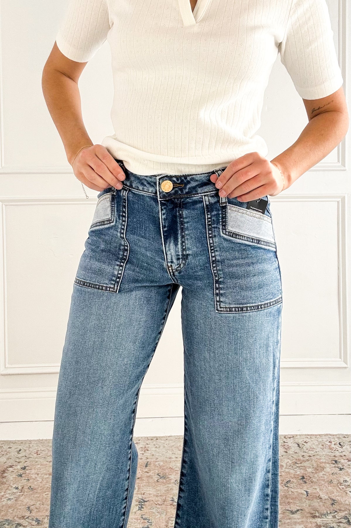 These high-rise wide leg jeans are finished with statement porkchop front pockets and a raw hem that gives them that slightly undone, lived-in look. The structured denim holds its shape while the relaxed leg keeps them feeling effortless and wearable.