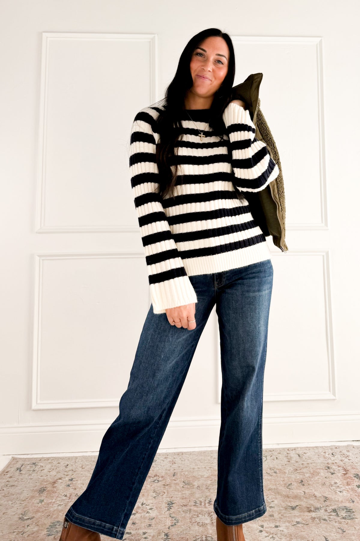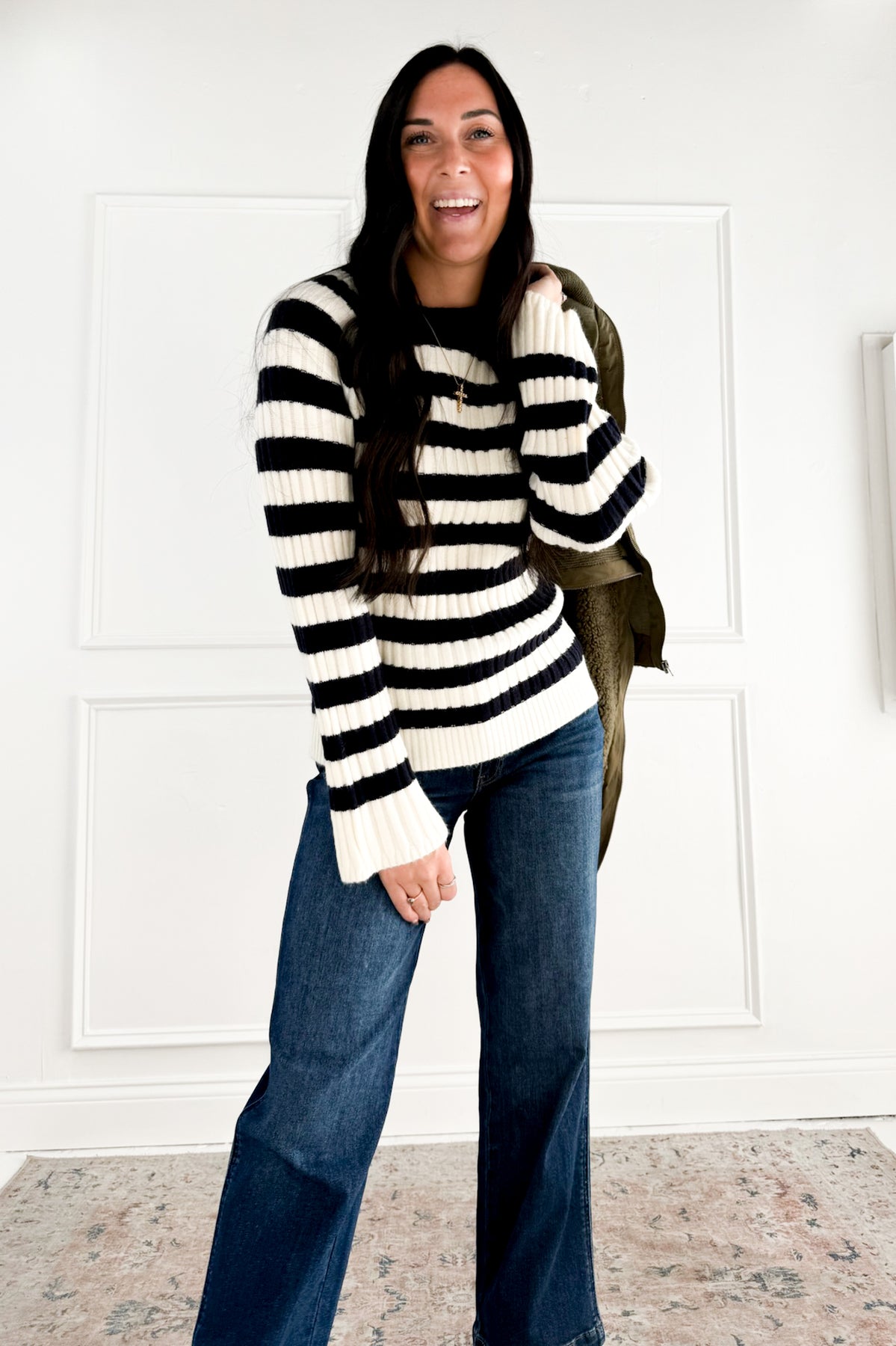 A timeless stripe with a modern twist. This ribbed crewneck sweater features soft textured knit, relaxed raglan sleeves, and subtle bell cuffs that give it a playful finish. Easy to style with denim or faux leather for a look that feels both classic and current.