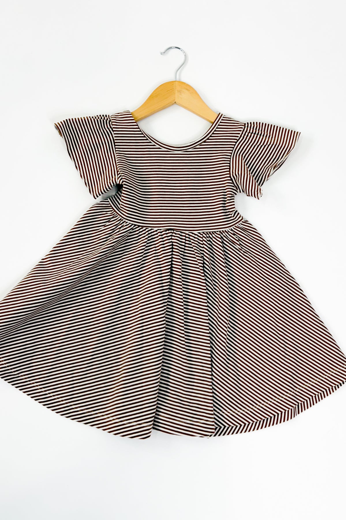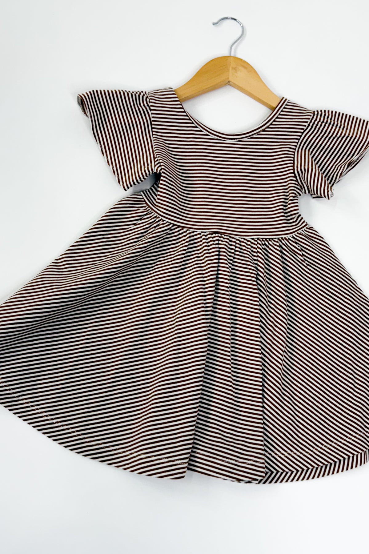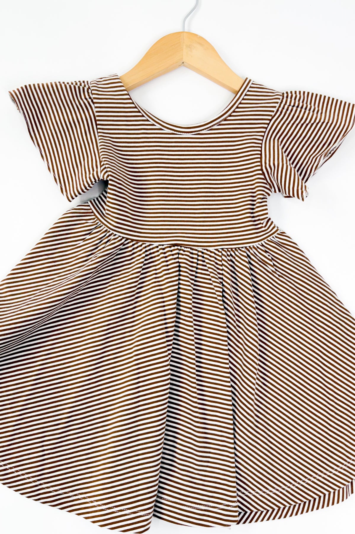 The Toffee Stripe Twirl Dress features classic toffee and cream stripes with flutter sleeves and a full, flowy skirt that’s perfect for twirling. Soft and comfortable, this dress is designed for everyday adventures while still looking extra cute.