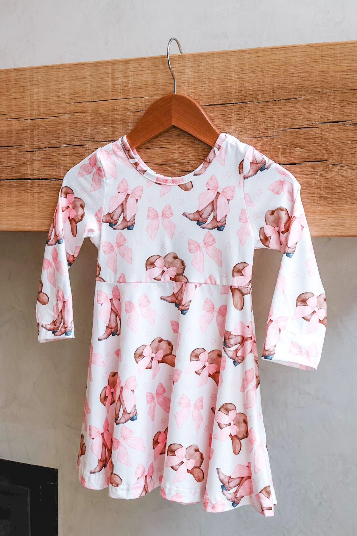 Y’all, this one’s too cute to corral! The Blush & Boots Dress is made for your little cowgirl with big dreams and even bigger twirls. Featuring a charming western print with cowboy hats, boots, and soft blush bows, this dress is comfy enough for playtime and darling enough for picture day.