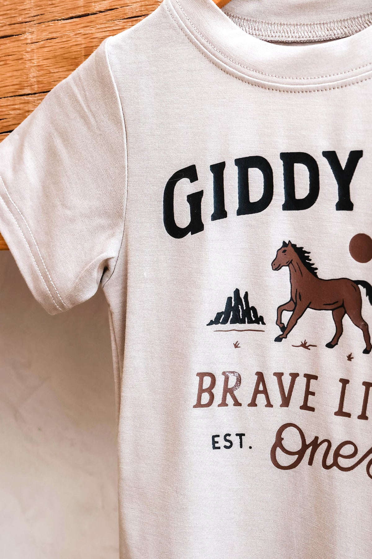 Time to round up some fun! Our Giddy Up Kids Tee is made for the little cowgirl or cowboy with big energy and even bigger style. Featuring a bold western-inspired graphic and comfy fit, this tee is perfect for everyday adventures, rodeo weekends, or playdates on the prairie.