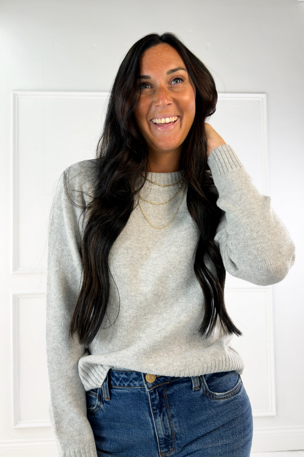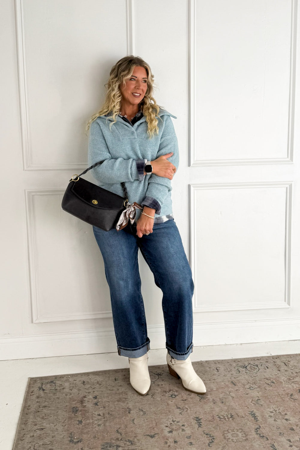 Crew Neck Half Button Pintuck Striped Fuzzy Sweater