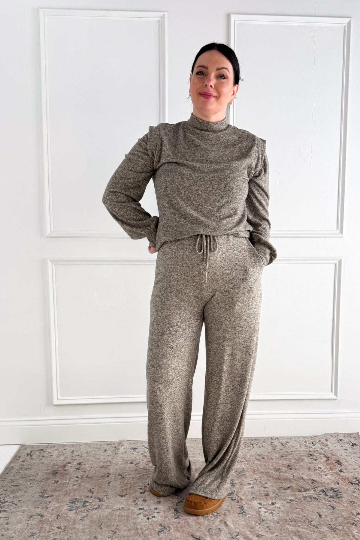 A soft brushed rib texture gives this top an easy, relaxed feel while the shoulder band detail adds a touch of structure. It features a straight hem, crew neckline, and full-length sleeves for a simple yet put-together look. Perfect on its own or layered under jackets and cardigans for everyday wear.