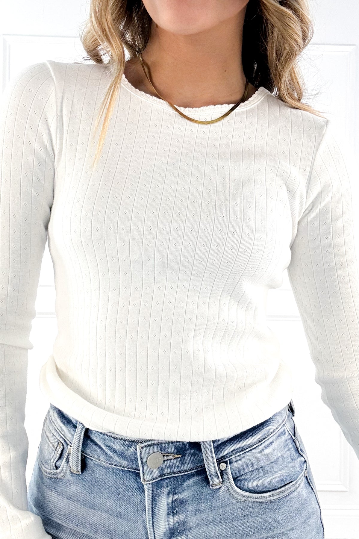 This fitted long sleeve top has a clean, streamlined look with subtle ribbing that adds just enough texture without feeling busy. The fabric has a soft, stretchy feel that hugs comfortably while staying easy to wear all day.