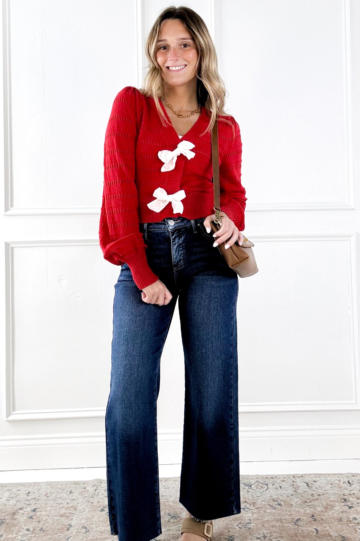 Flirty and festive, this cropped cardigan features two statement contrast bows and a delicate pointelle knit pattern throughout. The fitted silhouette and deep V-neckline make it an eye-catching piece that’s perfect for dressing up denim or pairing with a skirt for holiday gatherings.