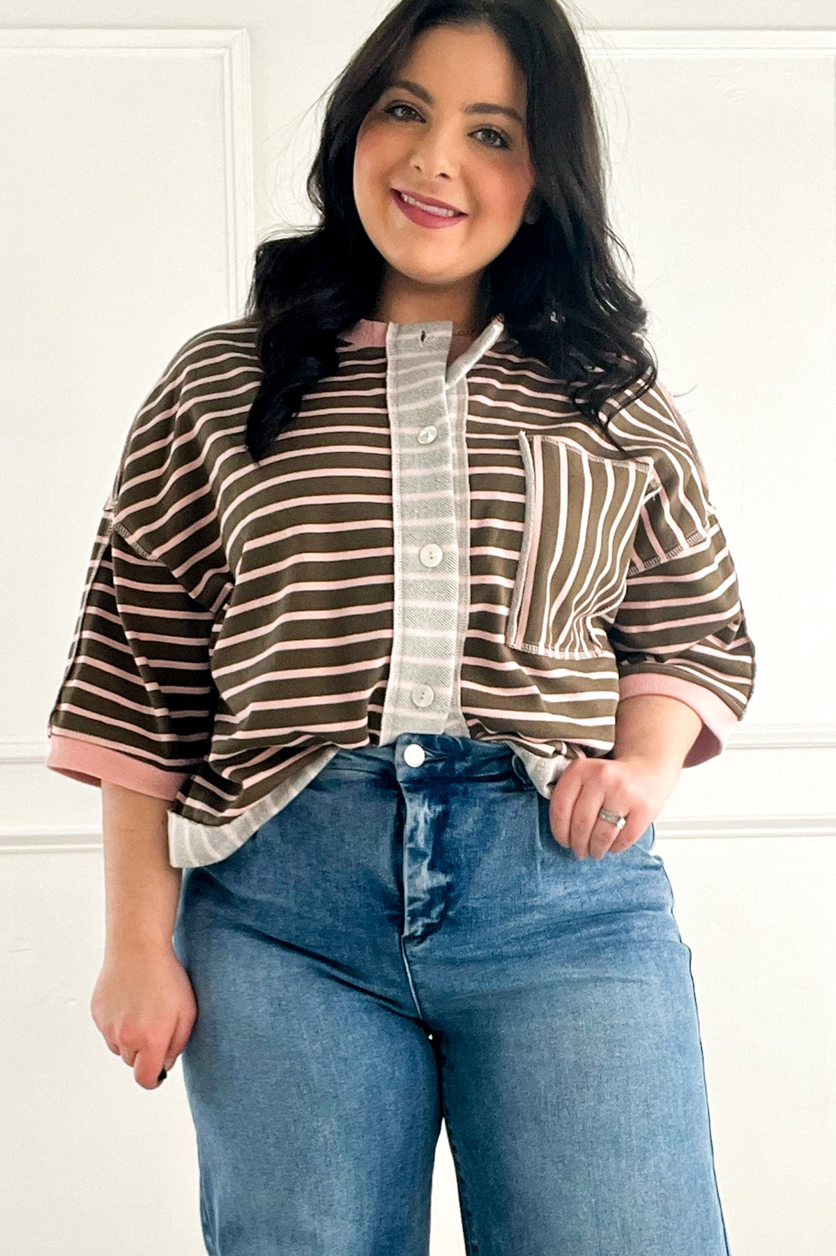 This half-sleeve jacket brings a fun, easygoing twist to classic stripes. The soft French terry knit keeps it comfy, while the mix-and-match stripe directions give it a playful, slightly retro vibe. The relaxed, boxy cut layers effortlessly over tanks and tees, and the button-front design makes it perfect for tossing on as you head out the door.