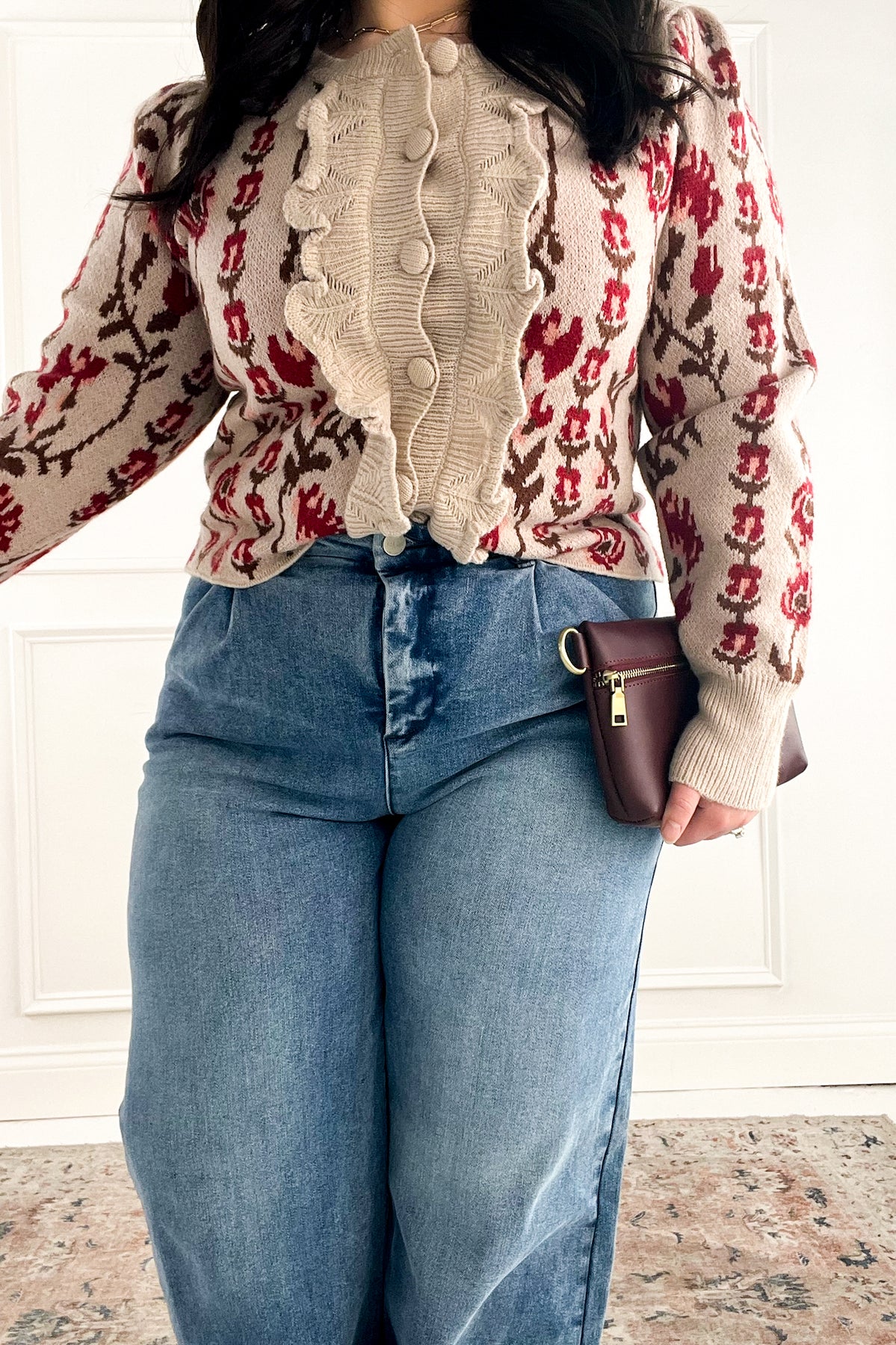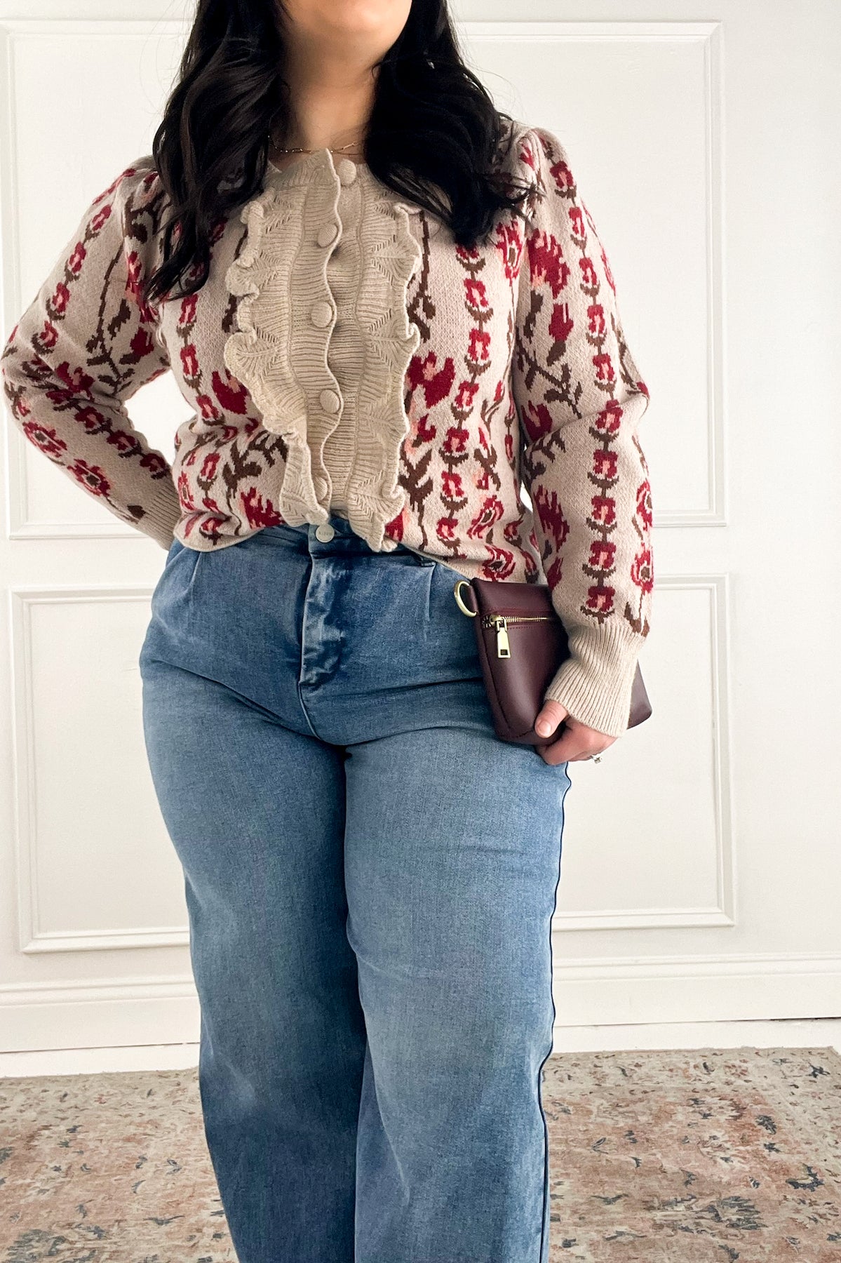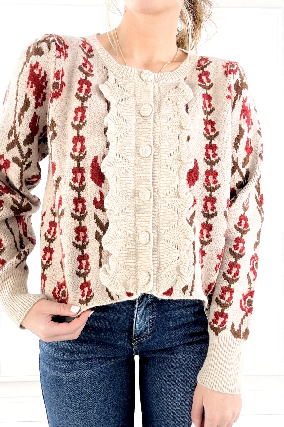 This cardigan brings a charming, vintage-inspired feel with its textured knit, puff sleeves, and bold vertical floral patterning. The covered buttons and scalloped detailing down the front add a romantic touch, making it an easy standout layered over denim for an effortlessly feminine look.