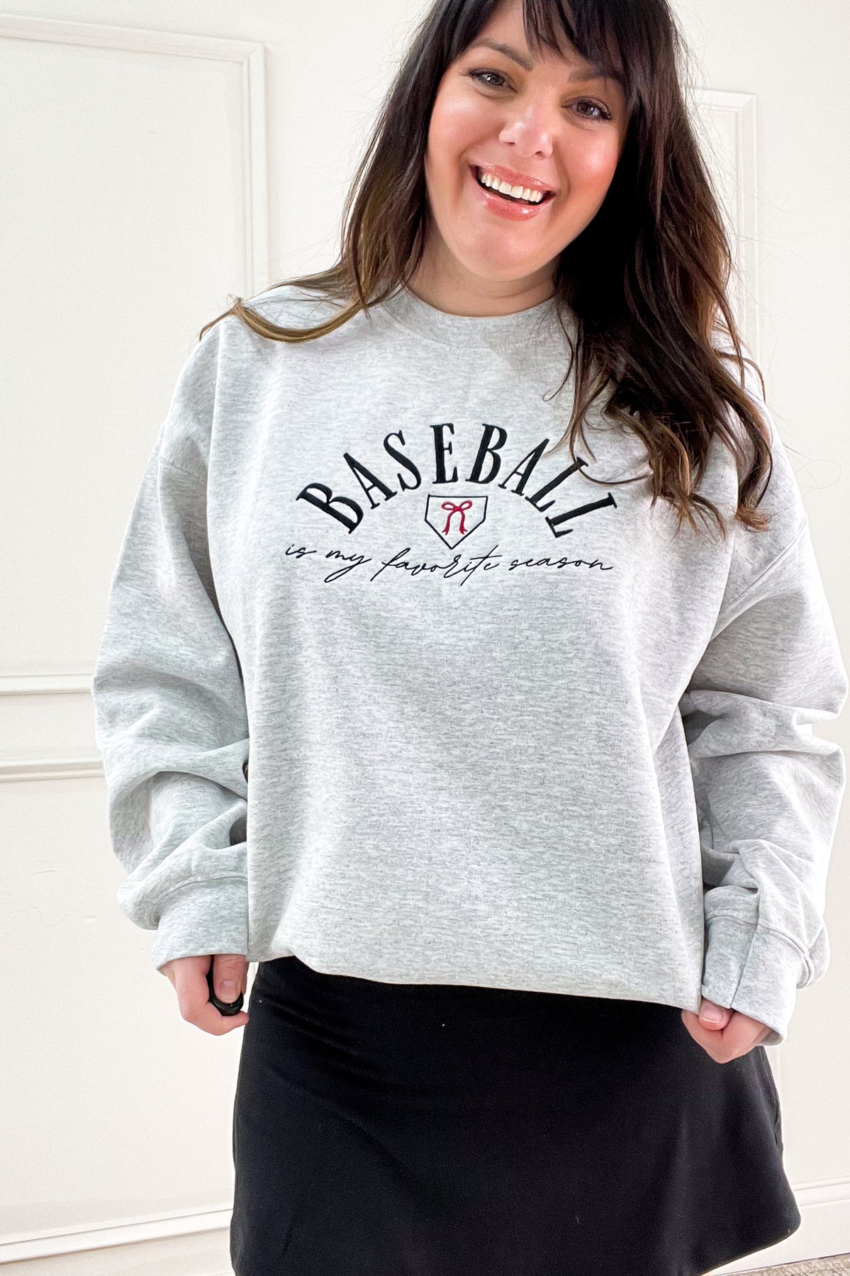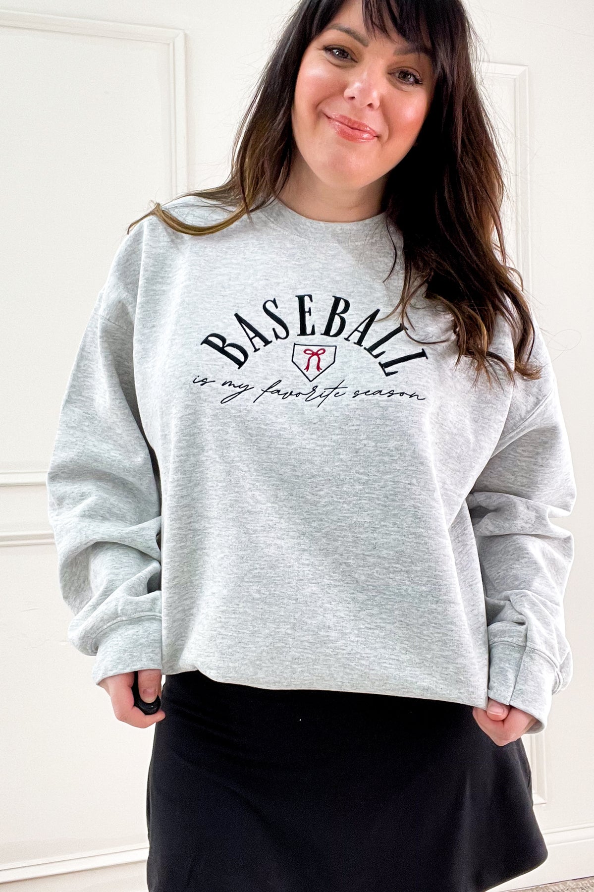 Because baseball season is the best season! This cozy sweatshirt features an embroidered coquette-style bow with the phrase “Baseball is my favorite season.”