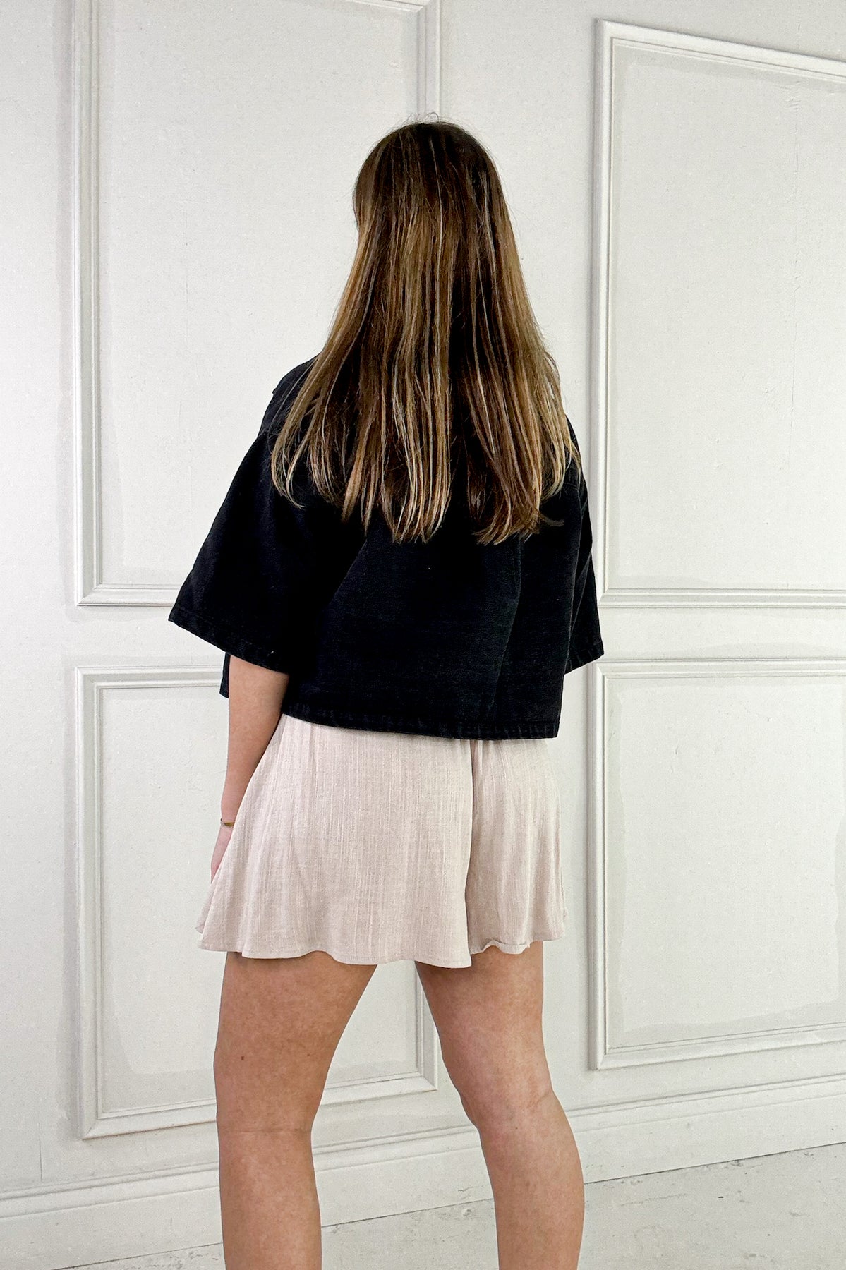 This cropped denim jacket features short sleeves, a classic button-up front, and a boxy silhouette that adds a cool, laid-back layer to any outfit. Perfect over dresses, tanks, or your favorite jumpsuit.