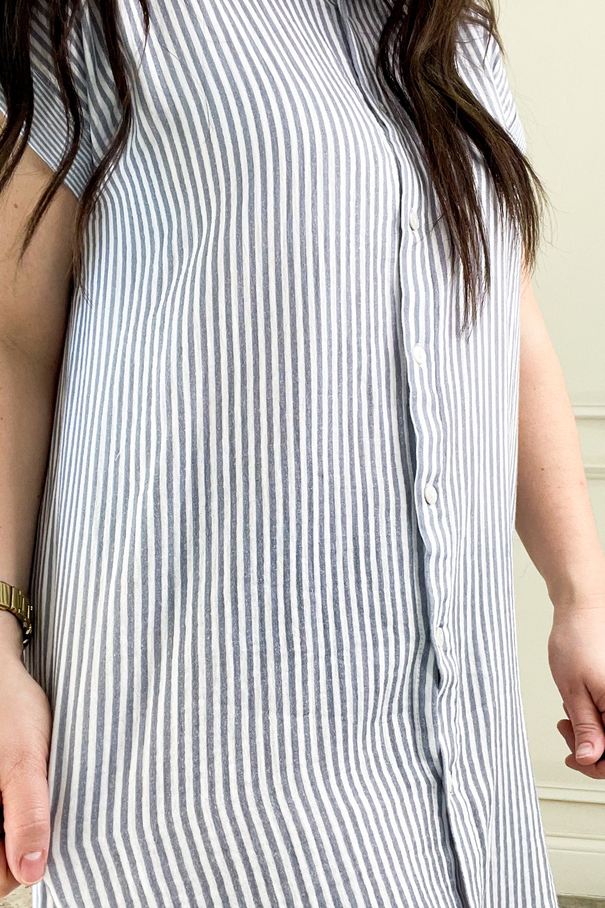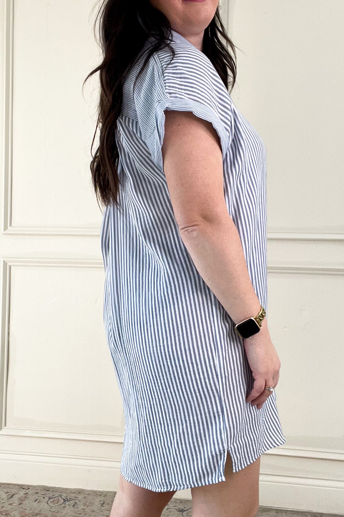 Crisp and casual, this mini dress features a classic collared neckline, cap sleeves, and a full button front for that easy shirt-dress feel. The shirt tail hem adds a subtle curve that keeps the silhouette polished and modern.