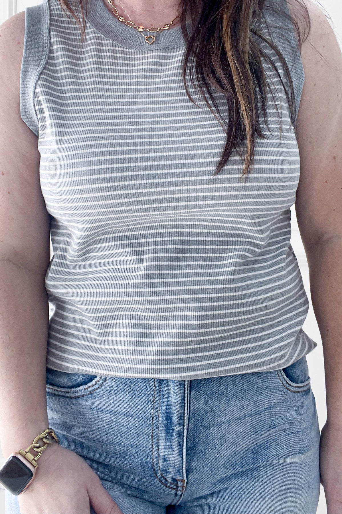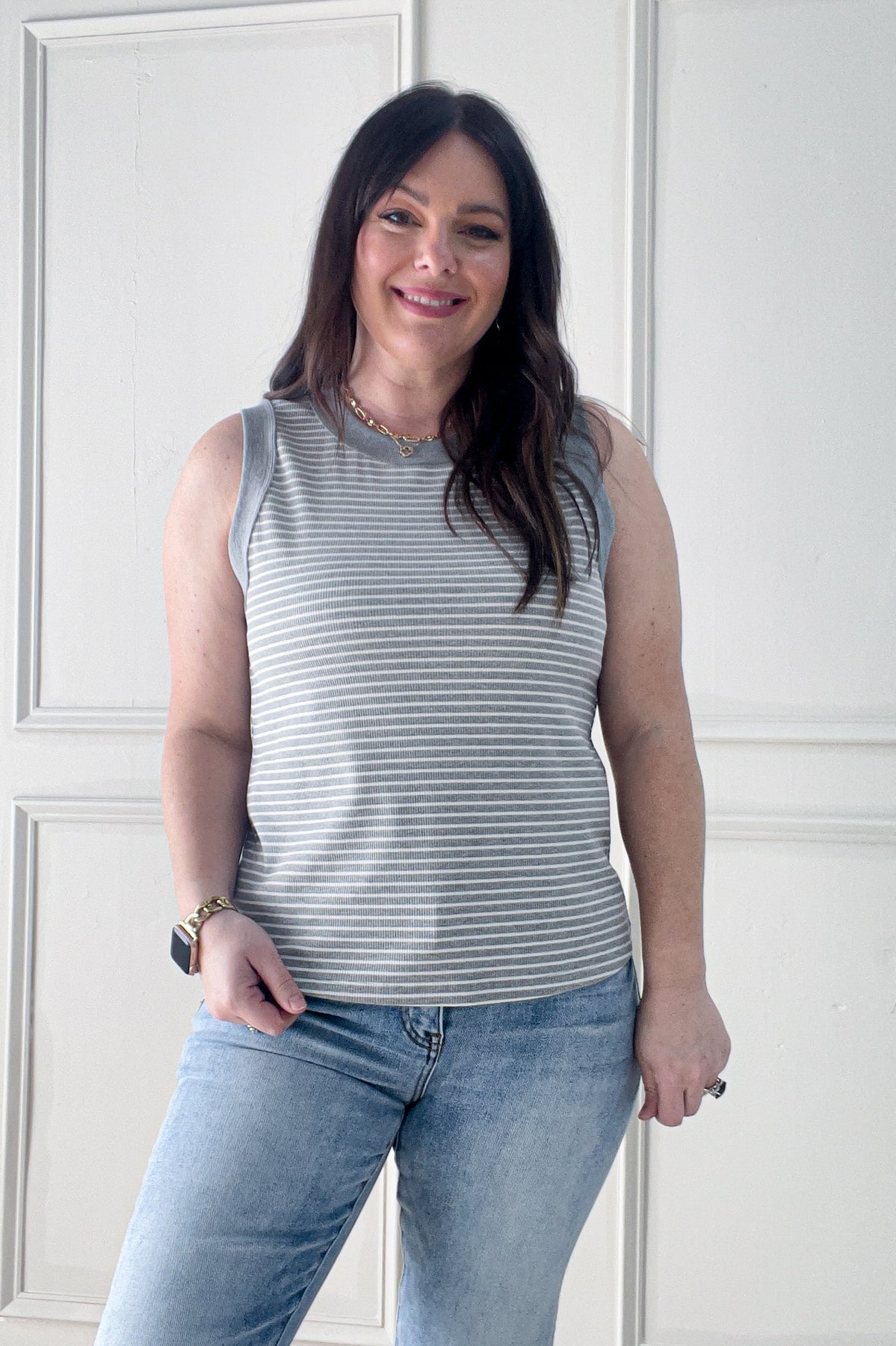 Bold stripes and out-seamed details give this ribbed tank a little extra edge. Lightweight and easy to style, it’s the perfect piece for layering or wearing solo.