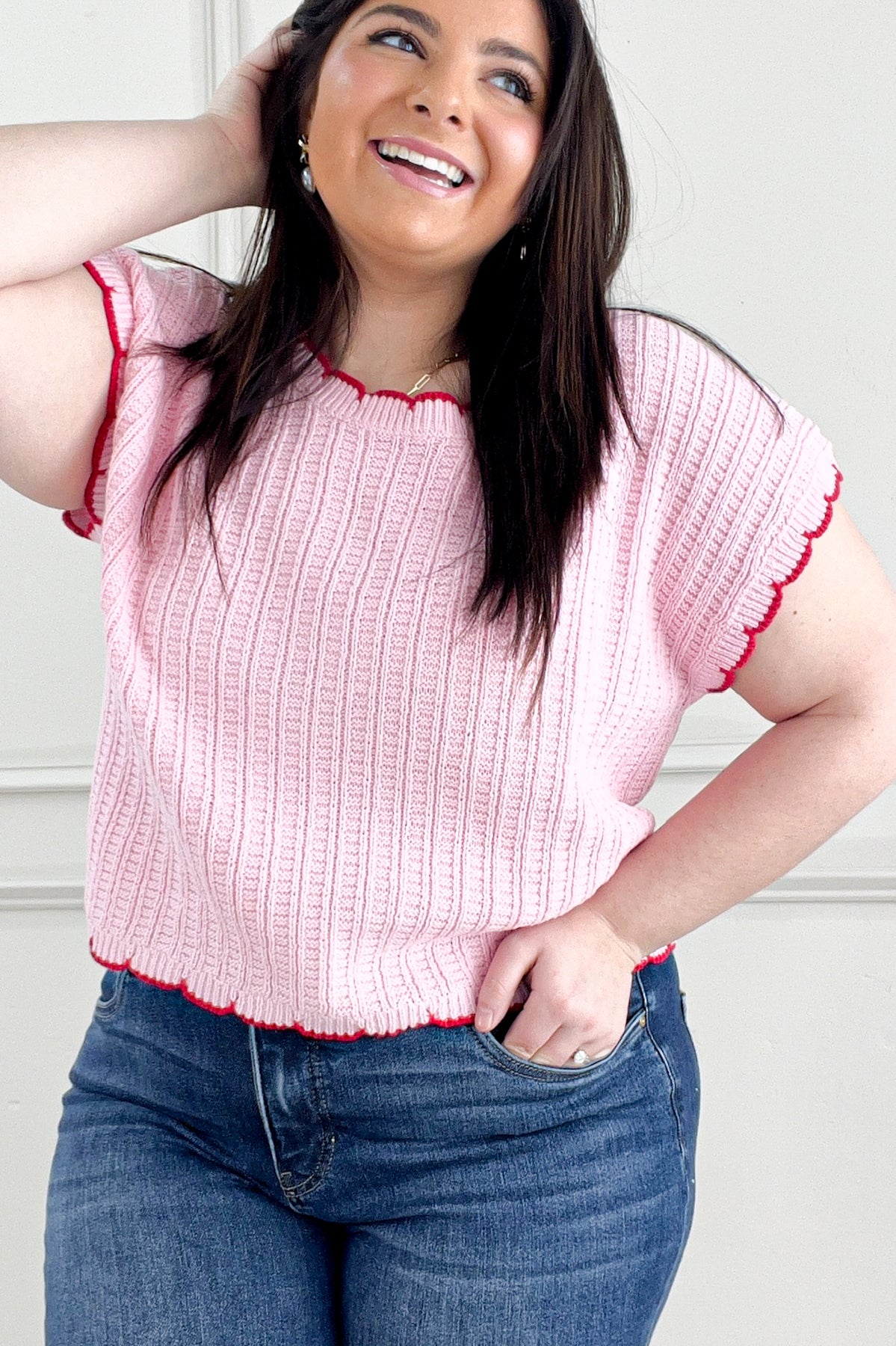 A sweater with serious charm! Featuring a delicate pointelle knit, scallop edging, and short dolman sleeves, this waist-length beauty is the perfect lightweight layer for breezy days.