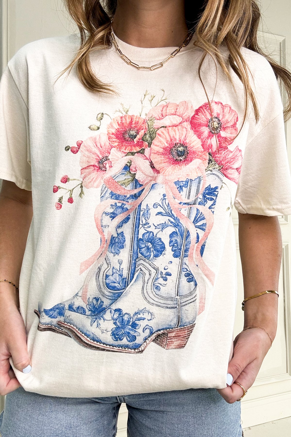 Western vibes meet floral charm on this cute graphic tee. With cowboy boots full of blooms, it’s the perfect mix of tough and sweet.